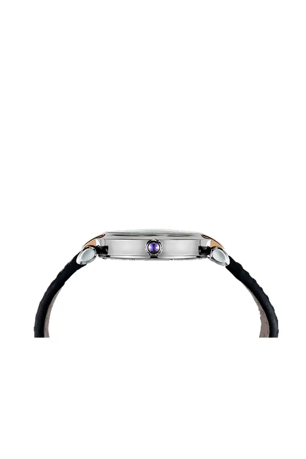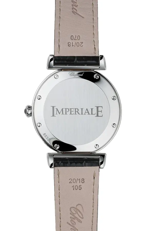 Pouzdro o průměru 36 mm je vyrobeno z ušlechtilé oceli, kterou zdobí prvky z 18karátového růžového zlata – kombinace, jež dodává hodinkám výjimečně elegantní vzhled. Pod safírovým sklíčkem se rozprostírá stříbrný ciferník s perleťovým středem, jehož jemné odlesky podtrhují ženskou ladnost. Na korunce září typický ametystový kabošon, charakteristický prvek kolekce Imperiale.