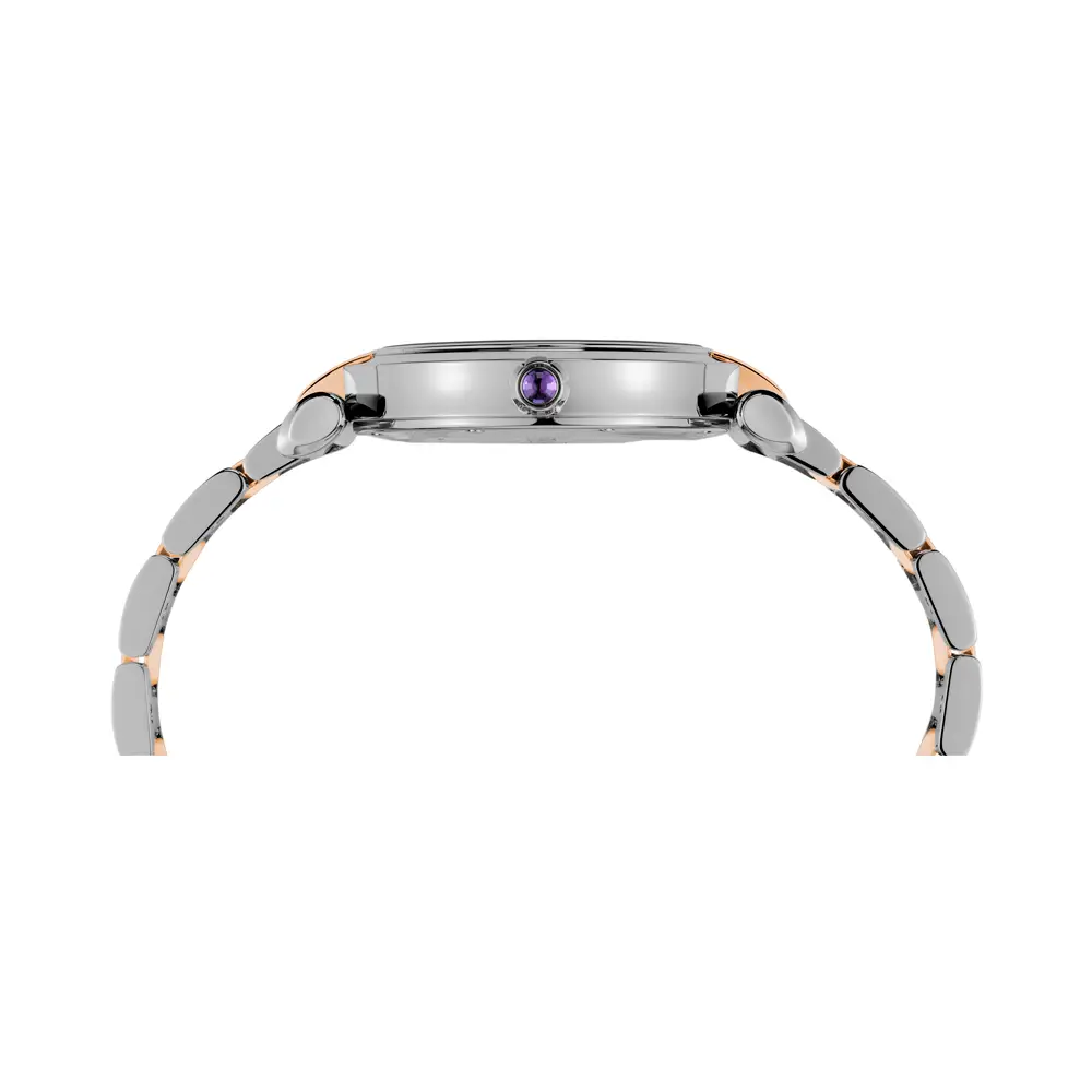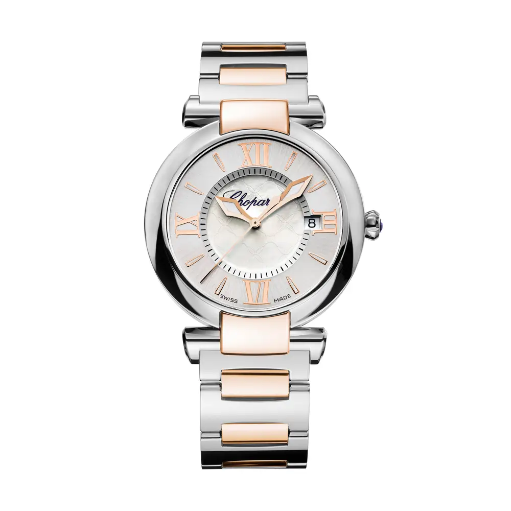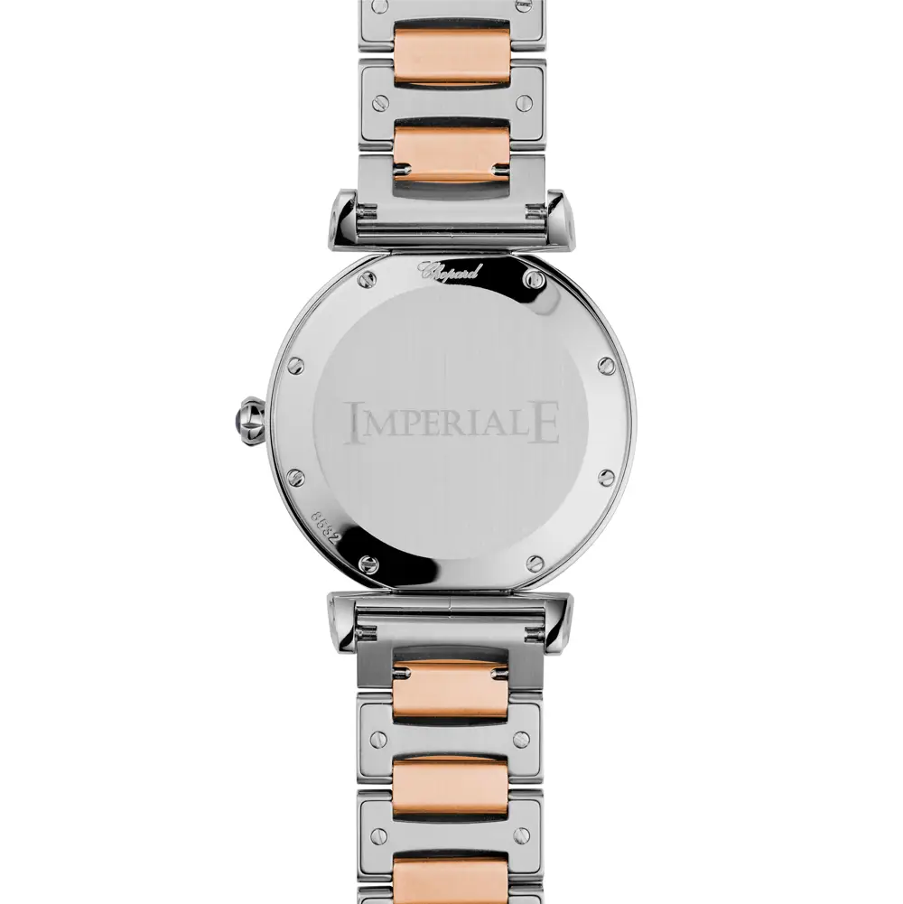 Pouzdro o průměru 36 mm je vyrobeno z leštěné nerezové oceli a doplněno o detaily z 18kt růžového zlata, které dodávají hodinkám hřejivý a luxusní vzhled. Safírové sklíčko chrání elegantní perleťový ciferník s jemnými odlesky, římskými číslicemi a decentními indexy, které podtrhují čistotu a harmonii celého designu. Korunku zdobí charakteristický ametystový kabošon, symbol kolekce Imperiale, jenž přináší dotek královské elegance.
