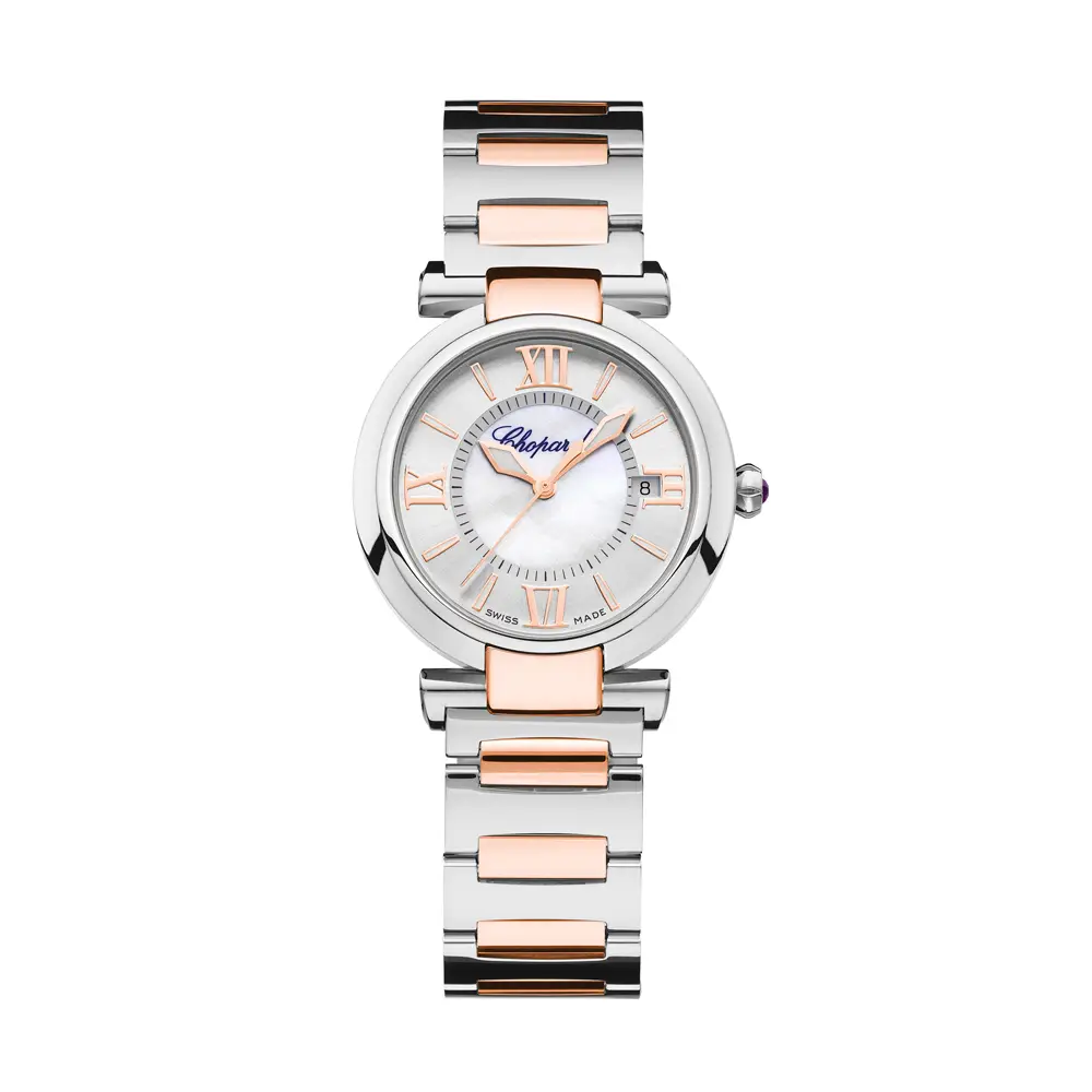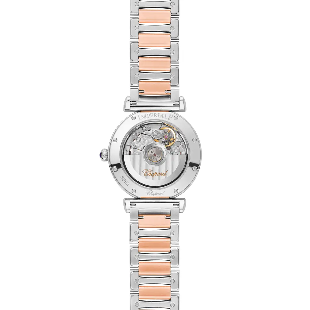 Chopard Imperiale 388563-6002 je ztělesněním nadčasové elegance, ženské síly a švýcarské preciznosti. Tento model z ikonické kolekce Imperiale vyniká harmonickým spojením nerezové oceli a 18kt růžového zlata, které vytváří jemný kontrast a dodává hodinkám výraz noblesy i moderního stylu.