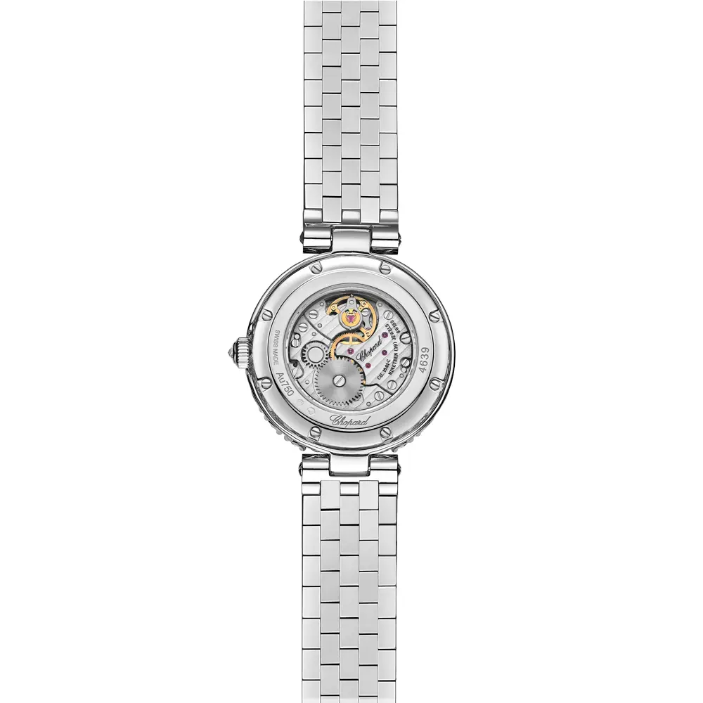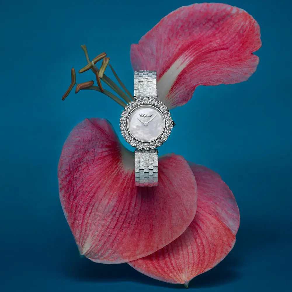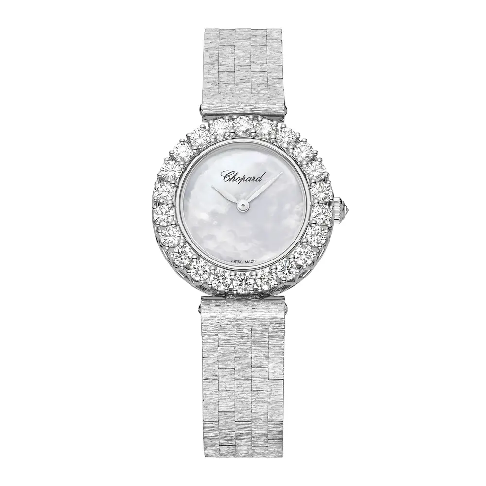 Uvnitř se skrývá manuální mechanický strojek Chopard kalibr 10.01-C, který zajišťuje přesné měření času s rezervou chodu až 45 hodin. Jemný perleťový číselník se proměňuje podle dopadajícího světla a doplňují jej zlaté ručky a korunka z bílého zlata. Safírové sklíčko s antireflexní úpravou a vodotěsnost 30 m doplňují špičkovou technickou kvalitu odpovídající prestiži značky Chopard.