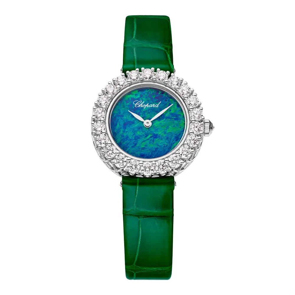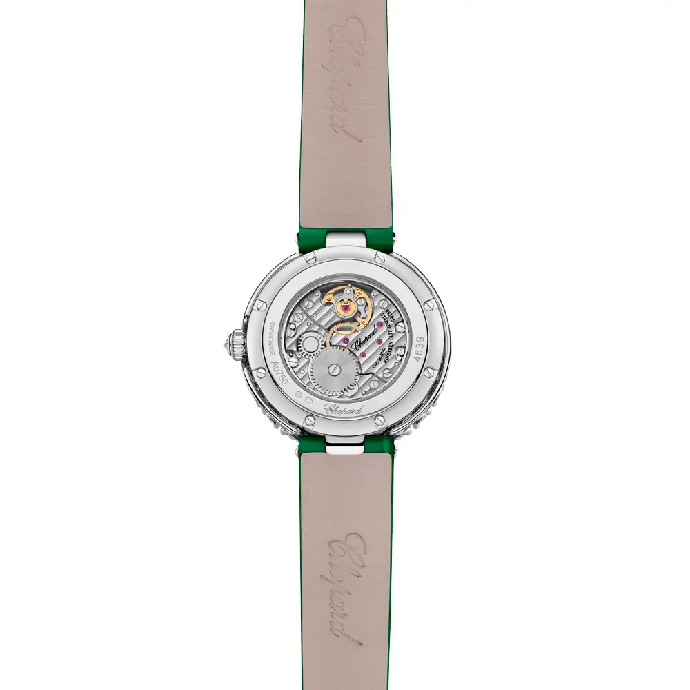 Uvnitř hodinek se nachází manuální mechanický strojek Chopard kalibr 10.01-C s rezervou chodu 45 hodin, zaručující přesnost a spolehlivost. Číselník z jemné perleti působí sofistikovaně a mění své odstíny v závislosti na světle, zatímco safírové sklíčko s antireflexní úpravou zajišťuje dokonalou čitelnost. Model je vodotěsný do 30 metrů, což poskytuje základní ochranu při běžném nošení.