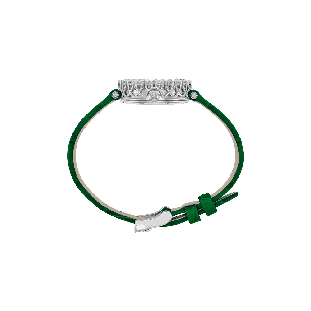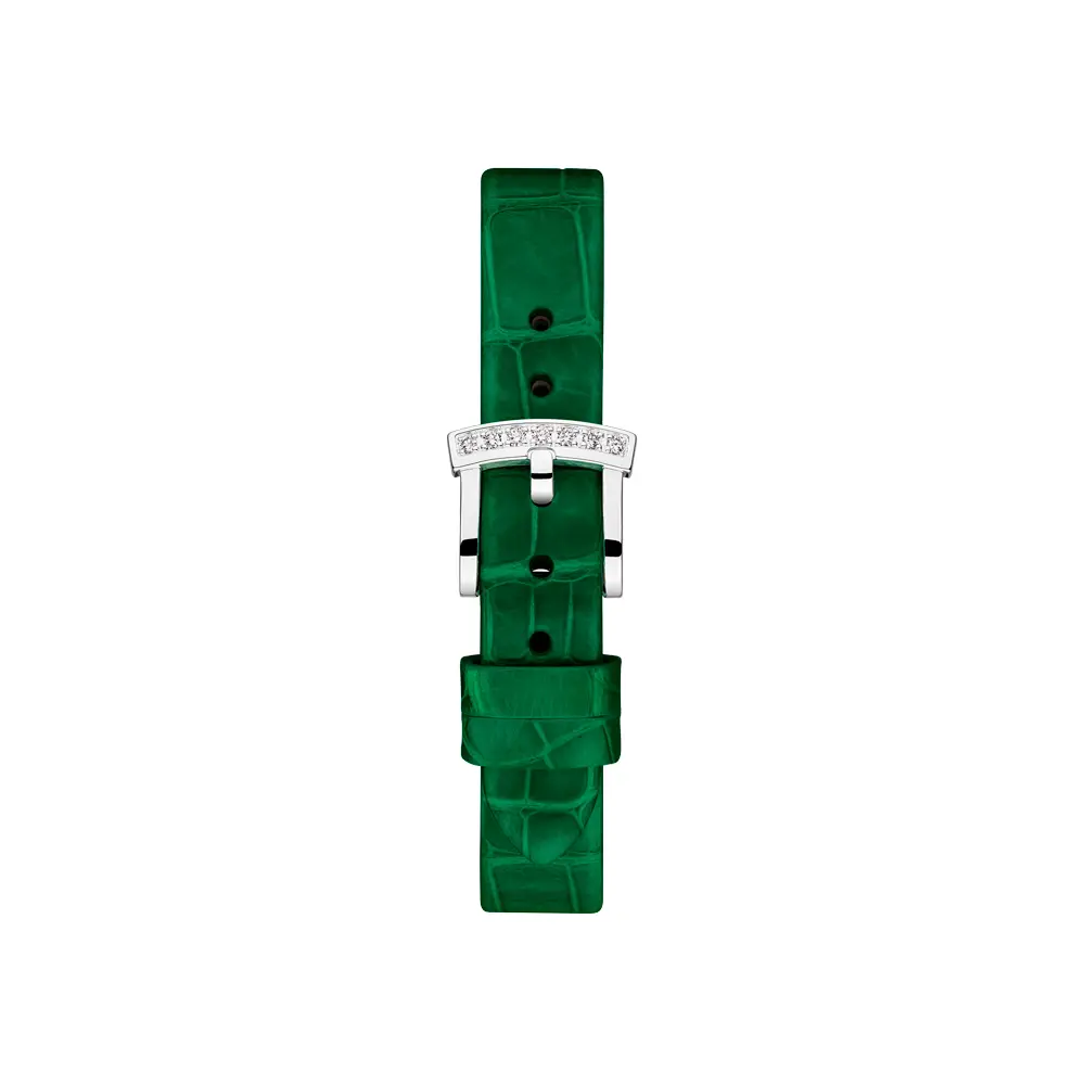 Elegantní dojem těchto hodinek završuje řemínek z lesklé kůže v sytě zelené barvě, který dodává celku svěží a moderní charakter. Kontrast mezi třpytem diamantů, bílým zlatem a zeleným tónem řemínku vytváří harmonickou rovnováhu mezi luxusem a osobitostí. L'Heure du Diamant Round 13A178-1316 jsou skutečným klenotem na zápěstí – symbolem věčné elegance, precizního řemesla a ženského půvabu.