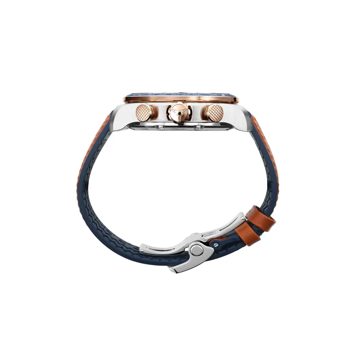 Hodinky doplňuje hnědý řemínek z kombinace kůže a kaučuku, který připomíná texturu pneumatik, a pohodlná překlápěcí spona pro bezpečné nošení. Safírové sklíčko chrání ciferník před poškrábáním a vnějším poškozením.