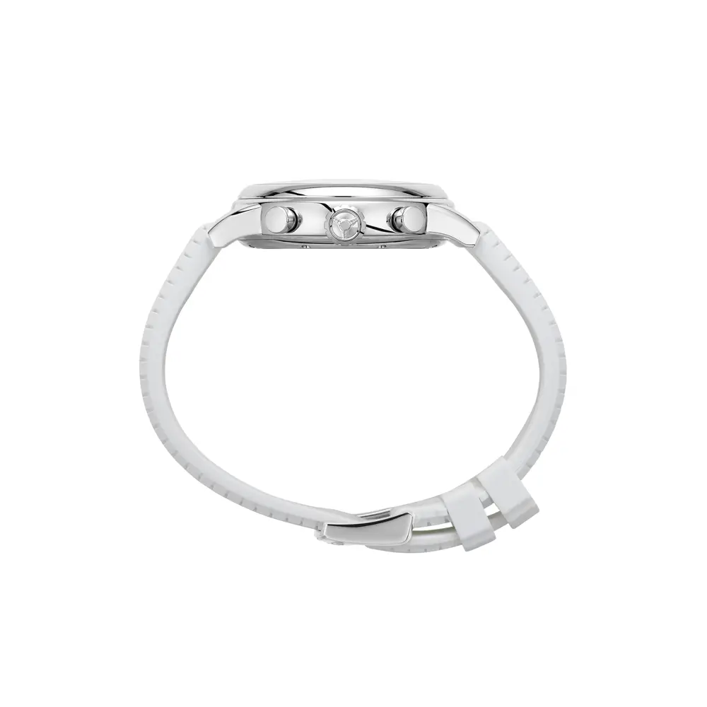Stříbrný ciferník, chráněný safírovým sklem, nabízí tři subciferníky a praktickou datumovku mezi čtvrtou a pátou hodinou. Sportovní duch hodinek podtrhuje bílý kaučukový řemínek s jemným reliéfem a trnovou sponou, který zajišťuje maximální pohodlí při nošení.