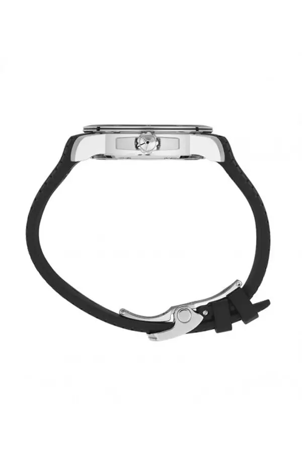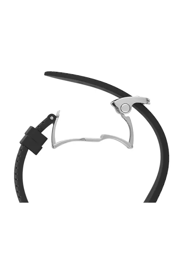 Design doplňuje černý kaučukový pásek s texturou inspirovanou vzorkem pneumatik Dunlop, zatímco překlápěcí spona zajišťuje pohodlné a bezpečné nošení.