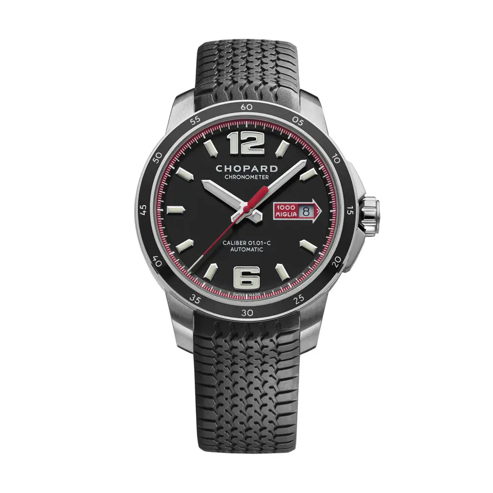 Model Mille Miglia GTS Automatic je oslavou vášně značky Chopard pro klasické automobilové závody. Robustní ocelové pouzdro o průměru 43 mm ukrývá černý analogový ciferník s dobře čitelnými indexy a praktickou datumovkou, který chrání safírové sklíčko odolné proti poškrábání.