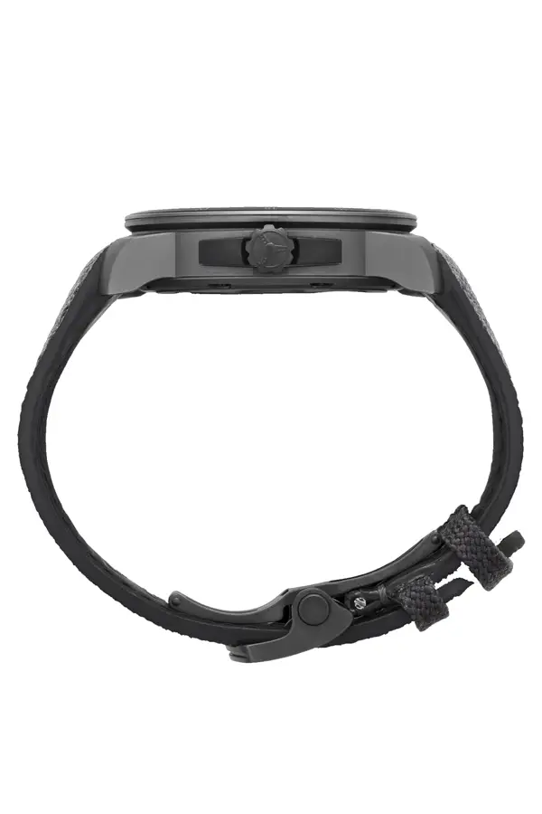 Černý textilní pásek s překlápěcí sponou dodává modelu sportovní nádech a vysoký komfort při nošení.