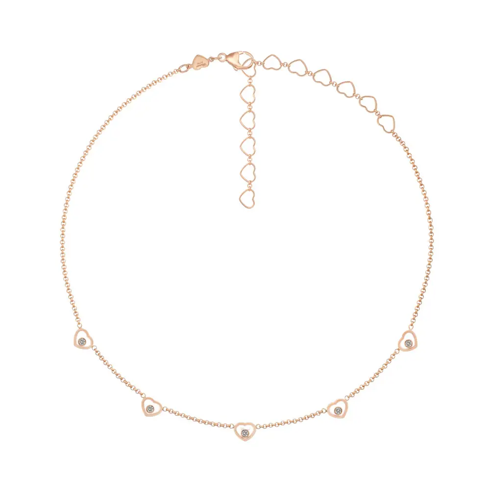 Chopard My Happy Hearts 81A088‑5501 je něžný a sofistikovaný náhrdelník z kolekce, která vzdává hold emocím, svobodě a ženské lehkosti. Je vyroben z 18karátového růžového zlata a osazen pěti srdíčky, z nichž každé obsahuje volně se pohybující diamant, chráněný mezi dvěma safírovými sklíčky. Tento ikonický design vytváří třpytivý efekt při každém pohybu a přitahuje pozornost s jemností a elegancí.