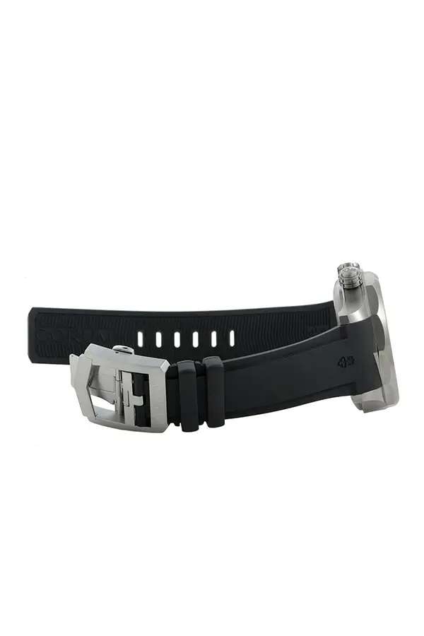 Robustní kulaté pouzdro o průměru 47 mm je vyrobeno z lehkého a odolného titanu, který zajišťuje pohodlné nošení i při velkorysé velikosti. Design doplňuje safírové sklíčko, které chrání černý analogový ciferník a zajišťuje skvělou čitelnost detailů.