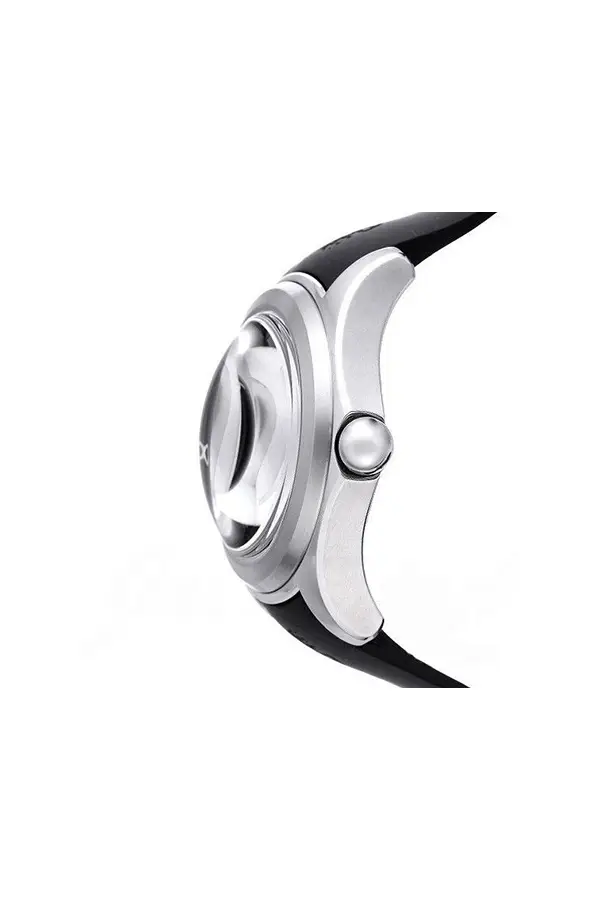Masivní kulaté pouzdro o průměru 47 mm je vyrobeno z kvalitní ušlechtilé oceli a doplněno o ocelovou lunetu, která podtrhuje moderní a robustní vzhled hodinek. Dominantním prvkem je klenuté safírové sklíčko, které opticky zvětšuje detailní motiv černého analogového ciferníku s motivem lebky, jenž je výrazným designovým prvkem této edice.