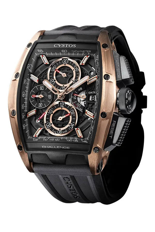 Pánské hodinky ze sportovní modelové řady Chrono II, která pochází z kreativní dílny značky Cvstos. Jsou voděodolné až do hloubky 100 metrů, tudíž jsou vhodné i pro plavce. Černý kaučukový pásek vhodně doplňuje pouzdro z titanu a 18karátového růžového zlata. Hodinky disponují funkcemi jako chronograf a datumovka.