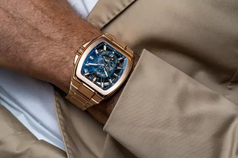 Jeho výrazné soudkovité pouzdro o rozměrech 41 x 42 mm, celé vyrobené z 18karátového růžového zlata, vytváří okouzlující kontrast se safírovým sklem a průhledným skeletonovým ciferníkem, který nabízí pohled do samotného srdce hodinek. Uvnitř se nachází strojek CVS410 SQLT s automatickým nátahem a rezervou chodu přibližně 42 hodin – nejen funkční, ale i vizuálně podmanivý.