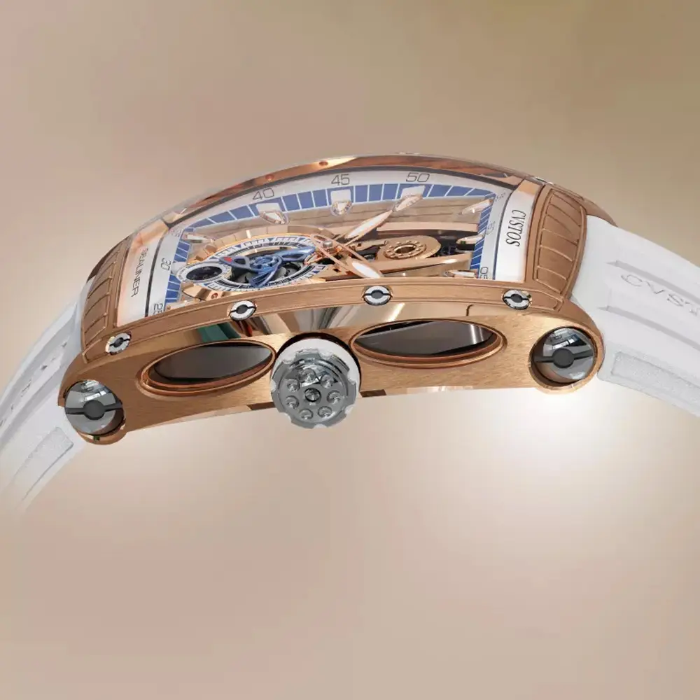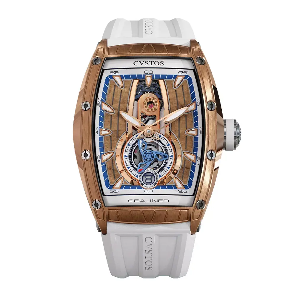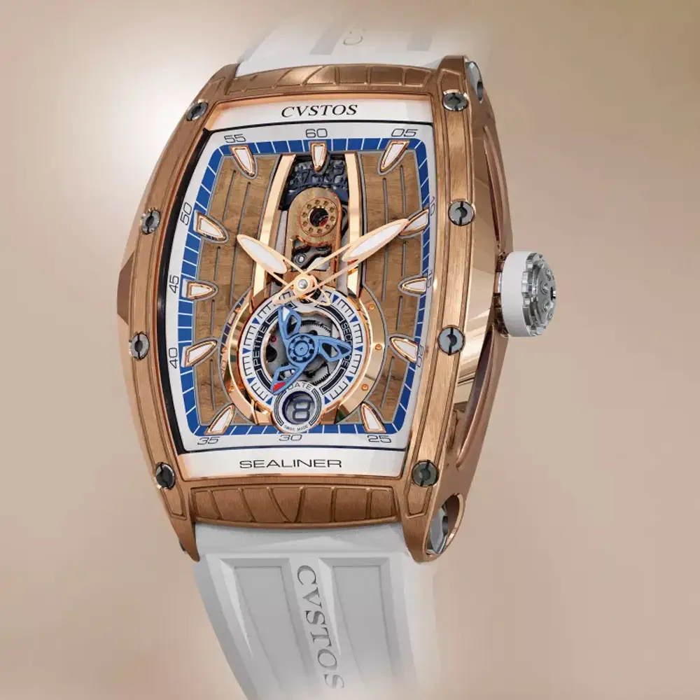 Model CVSTOS Sealiner PS Thirty6 5N Red Gold/Titan spojuje moderní hodinářskou estetiku s jemnými nautickými prvky, které jsou pro kolekci Sealiner charakteristické. Tonneau pouzdro o velikosti 47,2 × 36 mm je vytvořeno z ušlechtilého 5N červeného zlata, doplněného o titanové detaily pro vyšší odolnost a sportovní nádech. Modrý skeletonizovaný ciferník „Sky Blue“ nechává nahlédnout do technického srdce hodinek a vytváří fascinující hloubku, kterou podtrhují luminiscenční ručky a indexy.