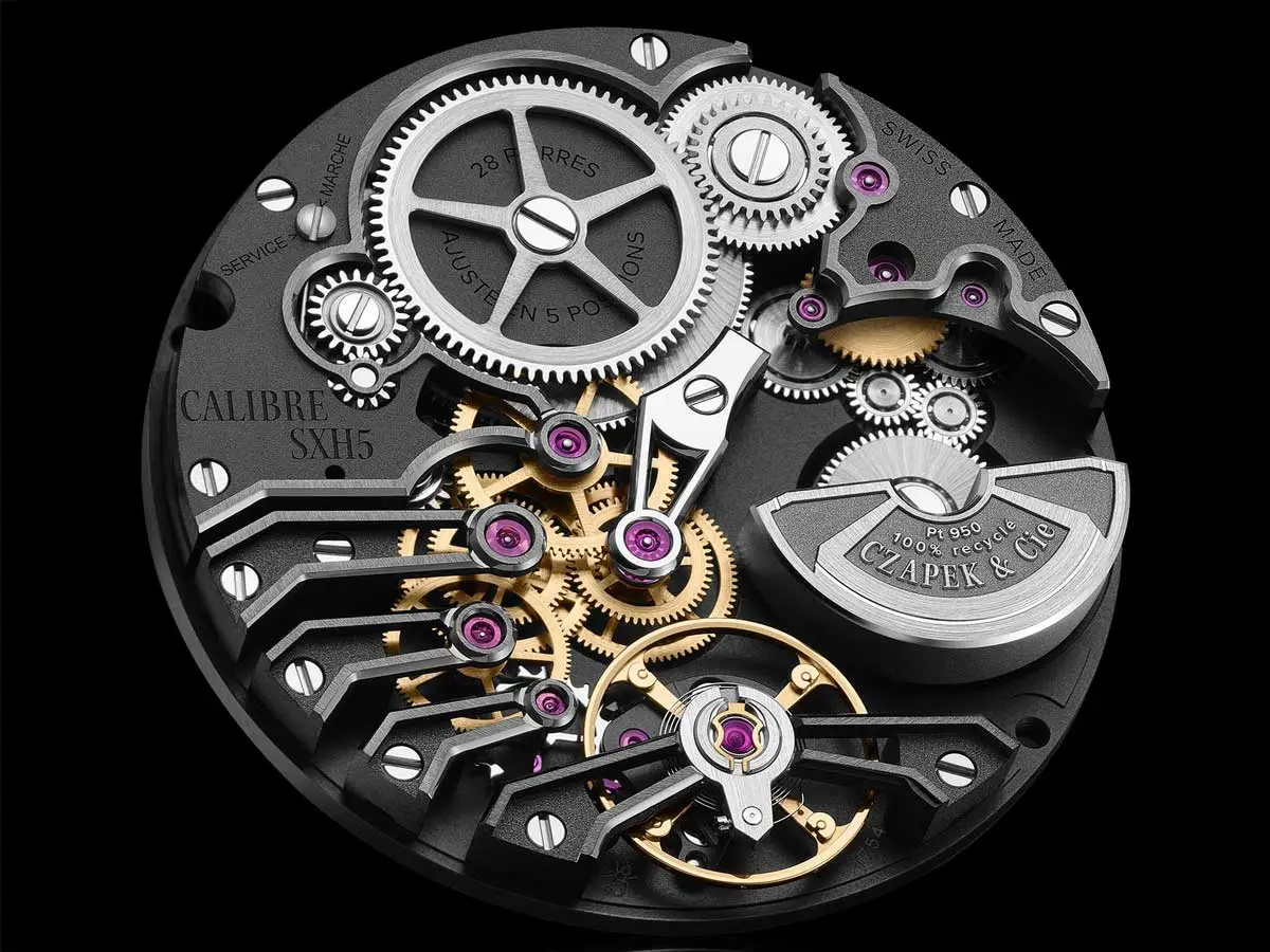 Uvnitř tiká manufakturní strojek SXH5 s mikrorotorem z 18kt zlata, rezervou chodu 60 hodin a fascinující architekturou viditelnou přes safírové dýnko. Strojek je plně zdoben ručně a demonstruje mistrovství švýcarské nezávislé hodinářské školy.