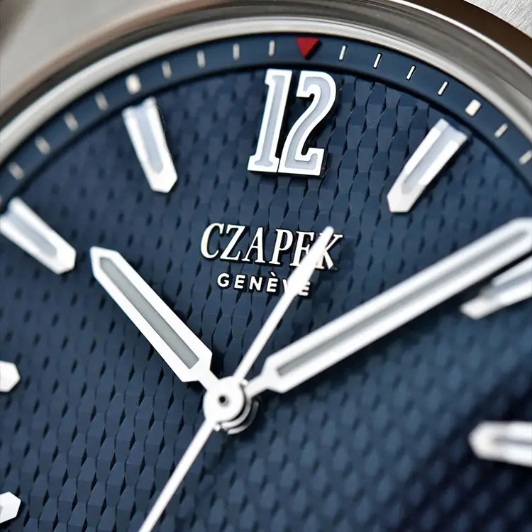 Pod hladkým povrchem září modrý ciferník, který připomíná hloubku oceánu. Analogové ručičky a indexy s luminiscencí zajišťují perfektní čitelnost i za šera. Funkce datumovky je decentně začleněna, aby nenarušovala čistý design.