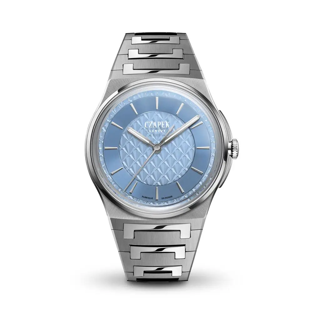 Hodinky Czapek Antarctique Sashiko Azure S přinášejí jedinečné spojení japonské estetiky a švýcarské hodinářské preciznosti. Jejich název odkazuje na tradiční japonskou výšivkovou techniku sashiko, která se promítá do výrazné struktury modrého analogového ciferníku. Tento netradiční vzor dodává hodinkám nezaměnitelný charakter a hloubku.