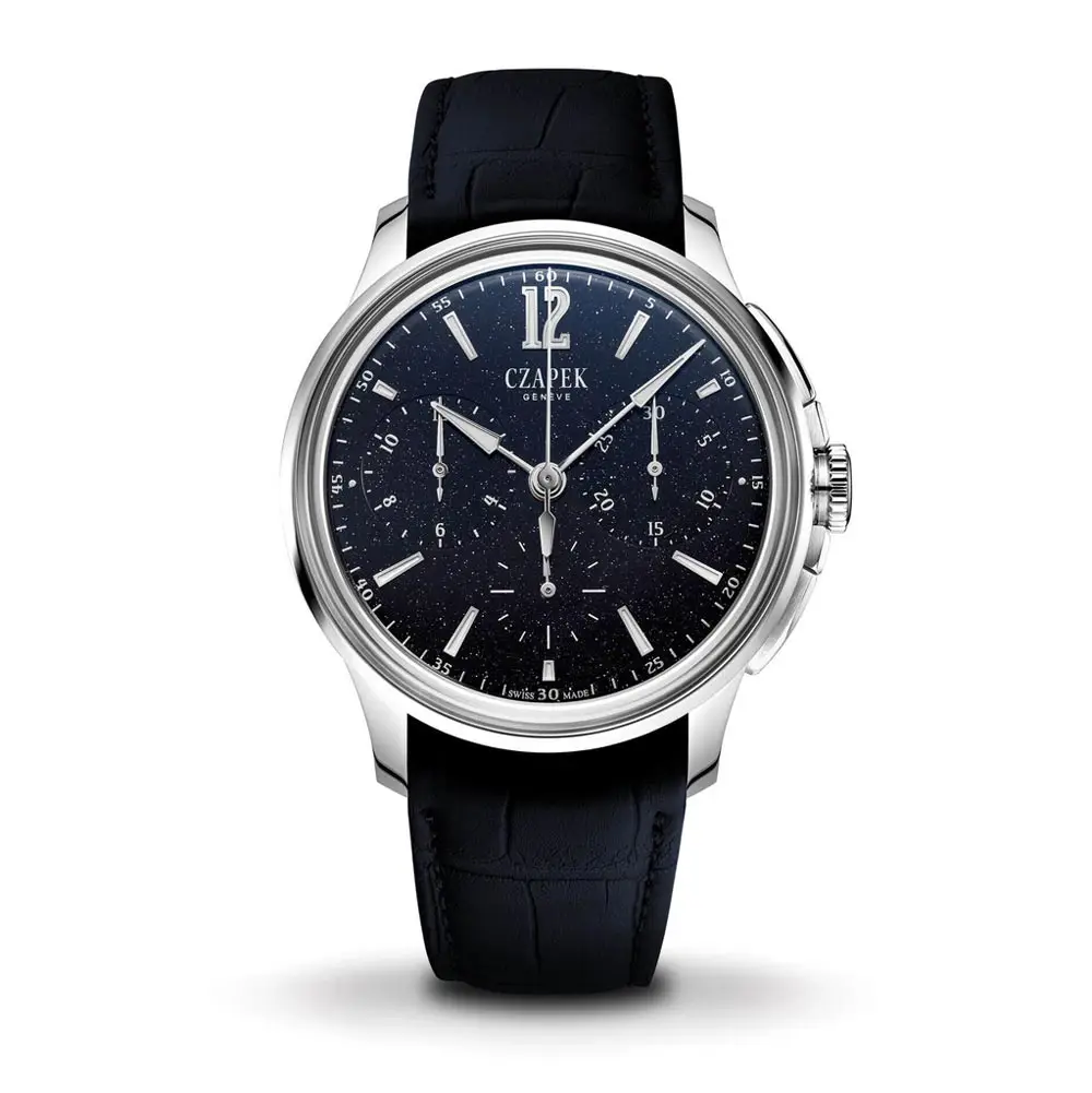 Czapek Faubourg de Cracovie Aventurine je ztělesněním hvězdné elegance a technické brilantnosti. Tento jedinečný model z dílny nezávislé švýcarské manufaktury oslní každého milovníka výjimečných chronografů – jak vzhledem, tak vnitřní sofistikovaností.