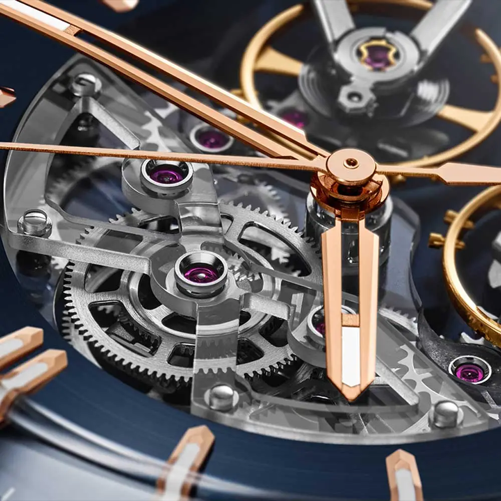 Exkluzivní charakter hodinek završuje sofistikovaný modrý řemínek z aligátoří kůže, doplněný elegantní a bezpečnou překlápěcí sponou z růžového zlata. S vodotěsností 5 ATM (50 metrů) jsou hodinky vhodné pro každodenní nošení, přičemž si stále zachovávají svůj elegantní šarm.