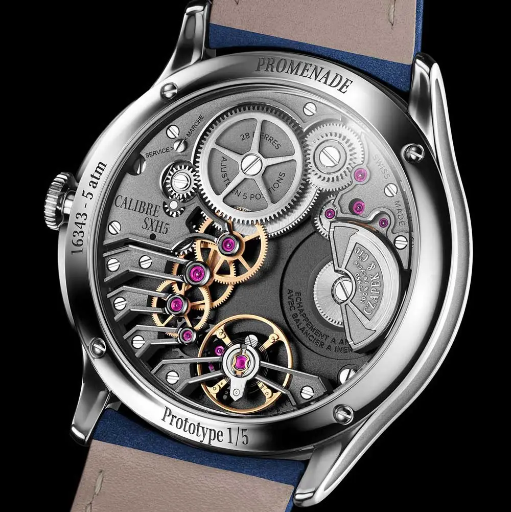 Mechanické srdce hodinek tvoří manufakturní kalibr SXH5 s automatickým nátahem, frekvencí 28 800 vph (4 Hz) a rezervou chodu 60 hodin. Strojek je viditelný skrz průhledné dýnko a odhaluje moderní architekturu můstků i jemné ruční dekorace, které ctí tradici haute horlogerie.
