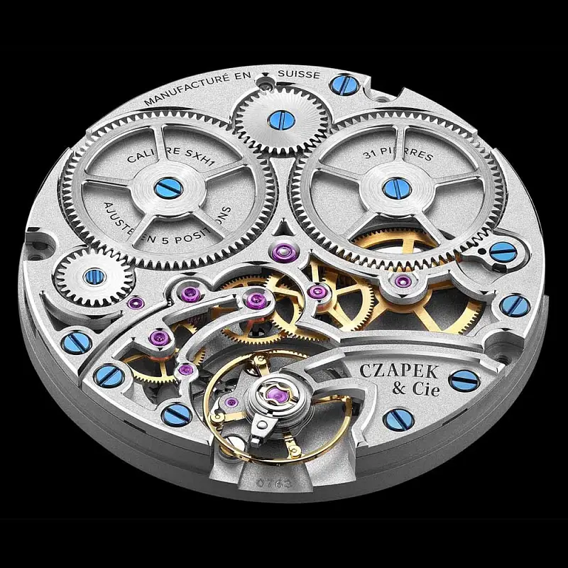 V srdci tohoto skvostu tiká manufakturní mechanický strojek SXH1 s ručním nátahem, který díky své impozantní rezervě chodu 168 hodin (7 dní) a frekvenci 21 600 vph (3Hz) garantuje nejen přesnost, ale i mimořádnou spolehlivost. Precizní ruční dekorace a detaily strojku lze obdivovat přes průhledné safírové dýnko.
