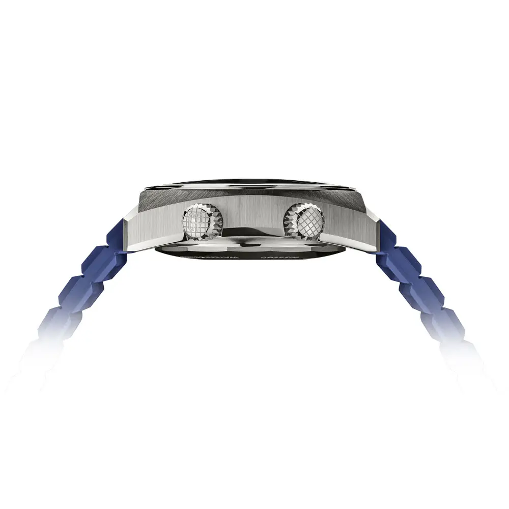 Pouzdro z titanu třídy 5 (40,3 × 38 mm) je odolné a lehké, vodotěsné do 200 m. Dvě korunky ovládají vnitřní otočnou lunetu a nastavení času. Číselník kombinuje oranžovou, modrou a bílou barvu s výraznými luminiscenčními prvky.