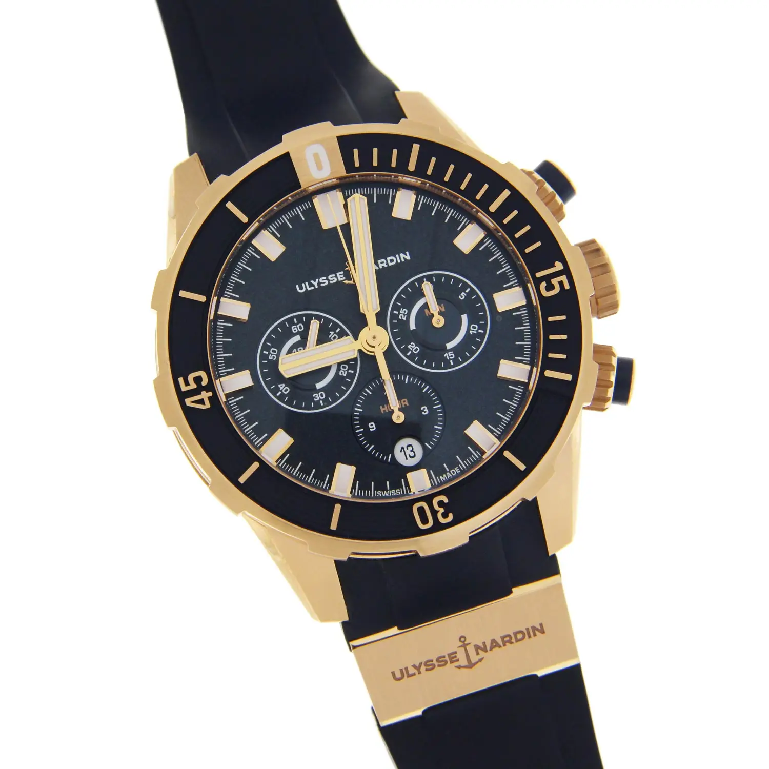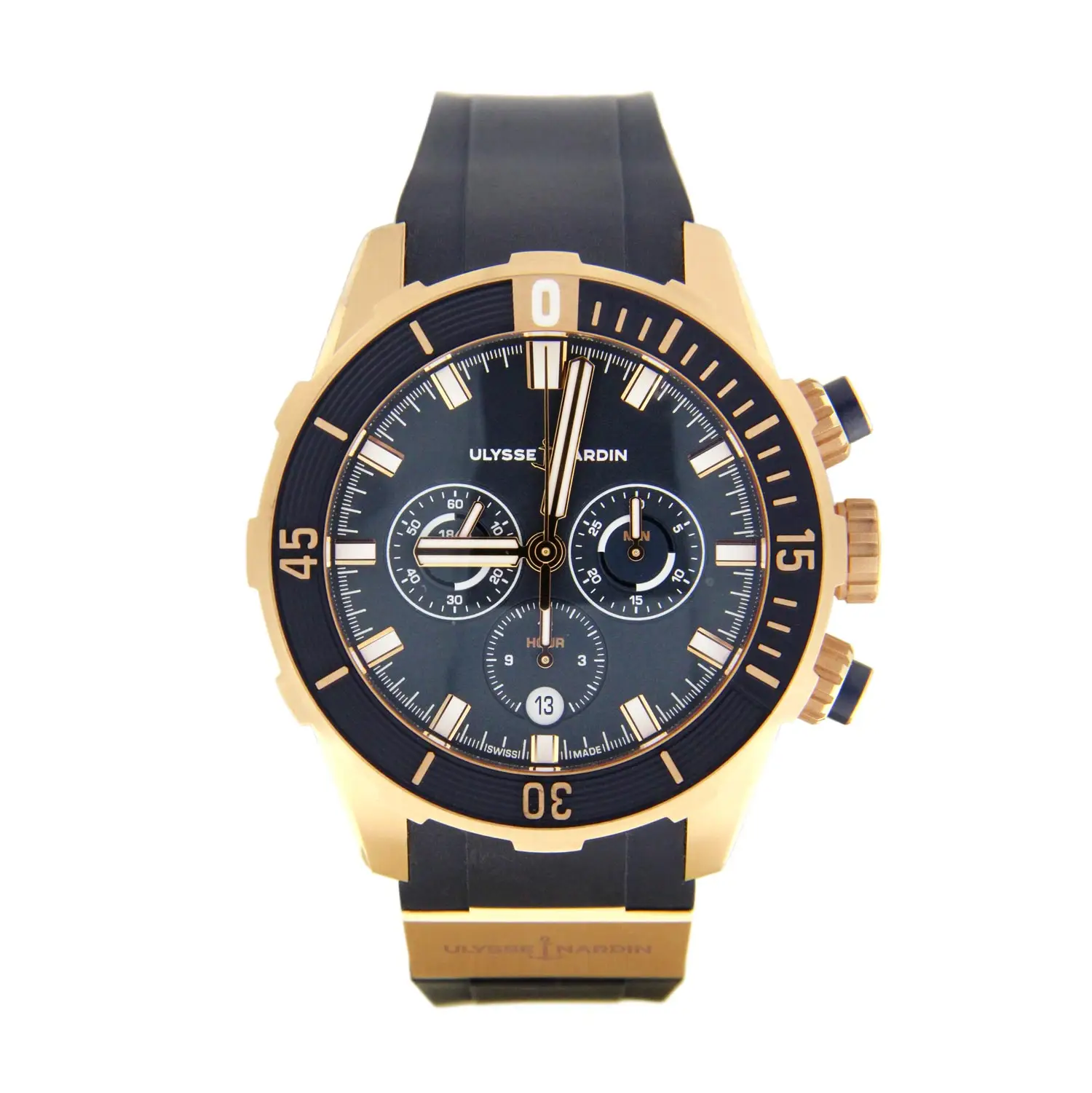Ulysse Nardin Diver Chronograph 1502-170-3/93 je sofistikovaný potápěčský chronograf, který v sobě spojuje robustní námořní výkon a luxusní provedení v 18karátovém růžovém zlatě. Tento 44mm model je navržen pro náročné uživatele, kteří od sportovních hodinek očekávají nejen funkčnost, ale i vytříbený styl.