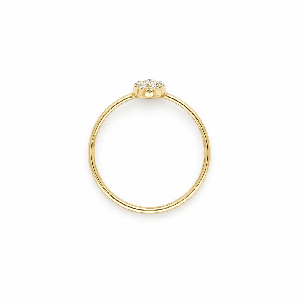 Elegantní zlatý prsten s třpytivými zirkony zaujme svou čistou linií a nadčasovým designem. Jemný hladký kroužek z kvalitního zlata je doplněn oválným motivem osazeným pečlivě broušenými zirkony, které prstenu dodávají decentní, ale výrazný lesk. Díky vyváženým proporcím působí šperk velmi elegantně a lehce.