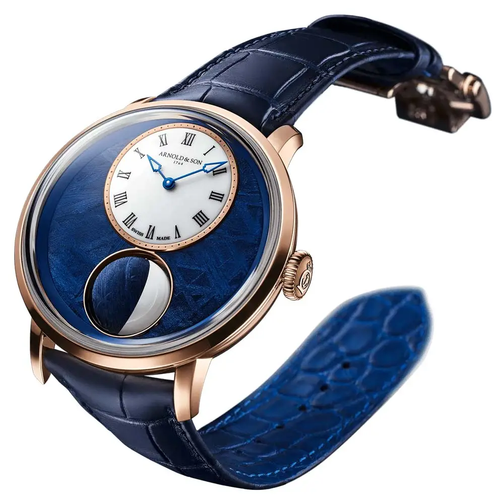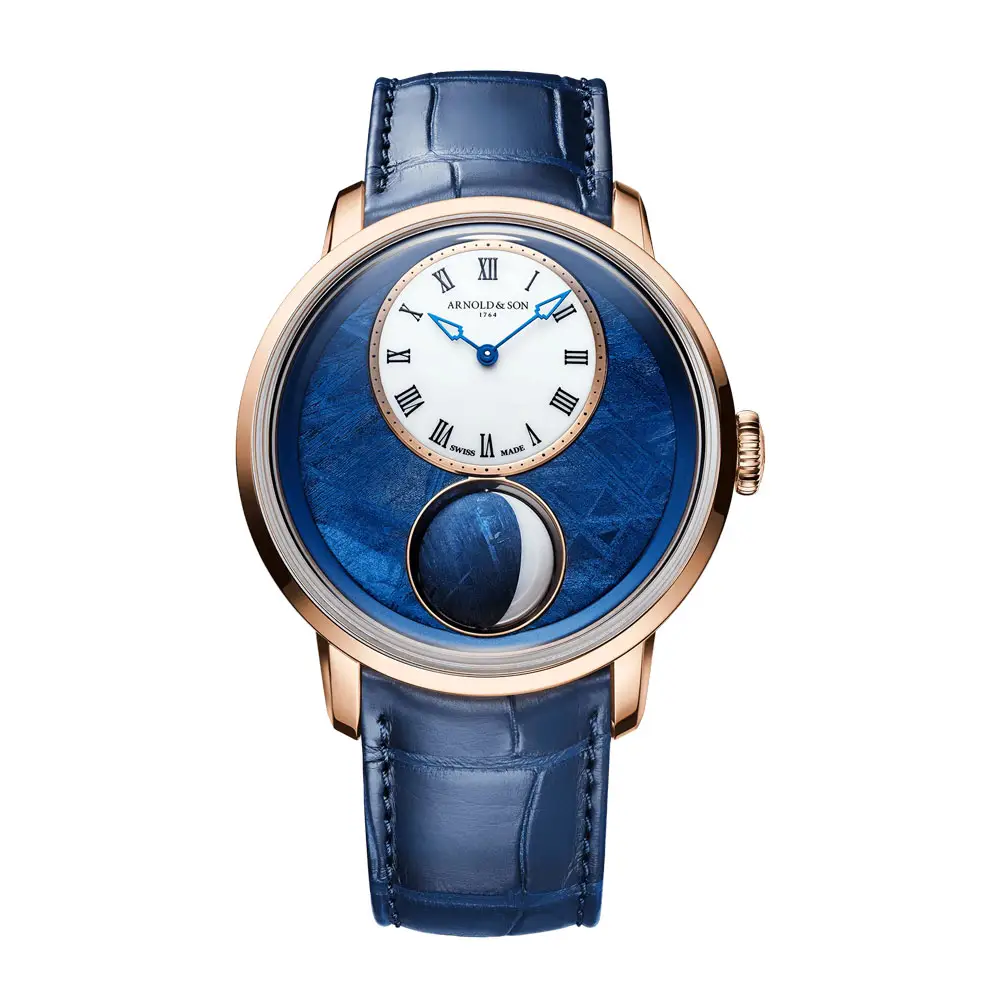 The 44 mm case is crafted from 18K red gold, giving the watch a sophisticated presence. The dial is made of blue PVD-treated meteorite, evoking the mysterious beauty of a night sky. The subdial, displaying hours and minutes, is made of white opal, whose milky glow complements the lunar complication.