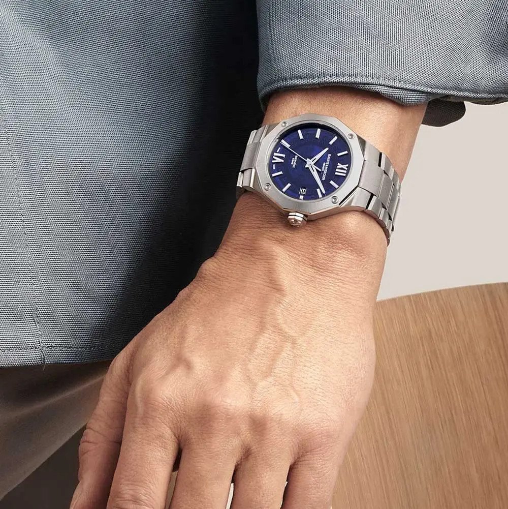 The 42 mm stainless steel case is complemented by the signature twelve-sided bezel, giving the watch its distinctive look. The blue dial with wave texture, protected by sapphire crystal, features a date window at 3 o’clock and excellent legibility in all lighting conditions.