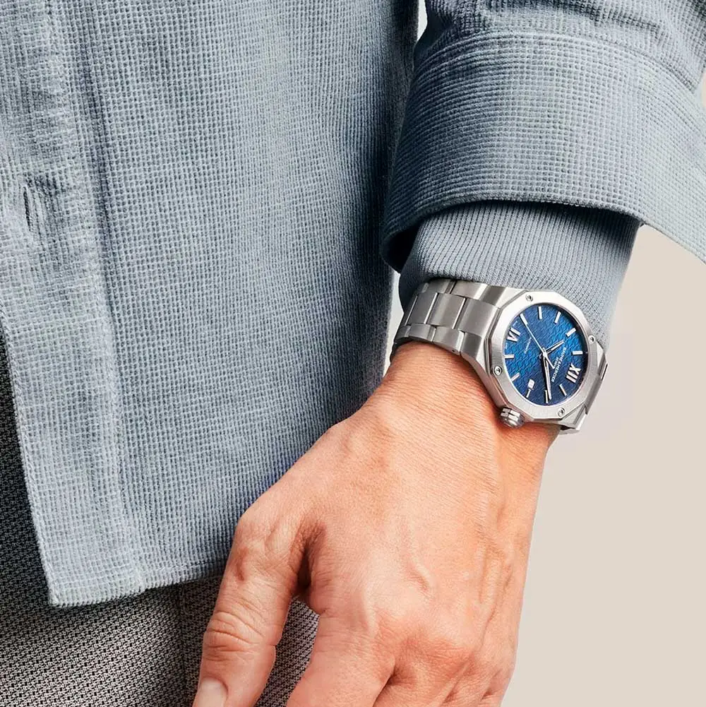 The 42 mm stainless steel case is complemented by scratch-resistant sapphire crystal, protecting the blue textured dial that exudes understated elegance. A date window at 3 o’clock adds everyday practicality without disrupting the clean design.