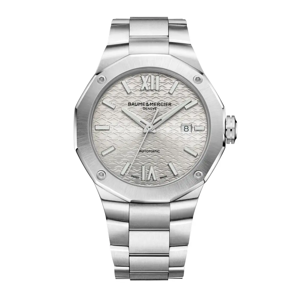 Baume & Mercier Riviera M0A10622 blends sporty elegance with the distinctive design that defines this iconic collection. The 42 mm polished stainless steel case is complemented by the signature twelve-sided bezel with four screws, giving the watch a bold and technical appeal. The silver sun-satin dial contrasts beautifully with the rhodium-plated hands and features a date window at 3 o’clock.