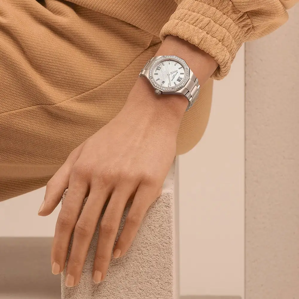 The 36 mm stainless steel case is complemented by a diamond-set bezel, adding brilliance and sophistication. The mother-of-pearl dial offers a soft, luminous appearance, protected by scratch-resistant sapphire crystal. A date window positioned at 3 o’clock enhances its practicality while maintaining a clean, elegant aesthetic.