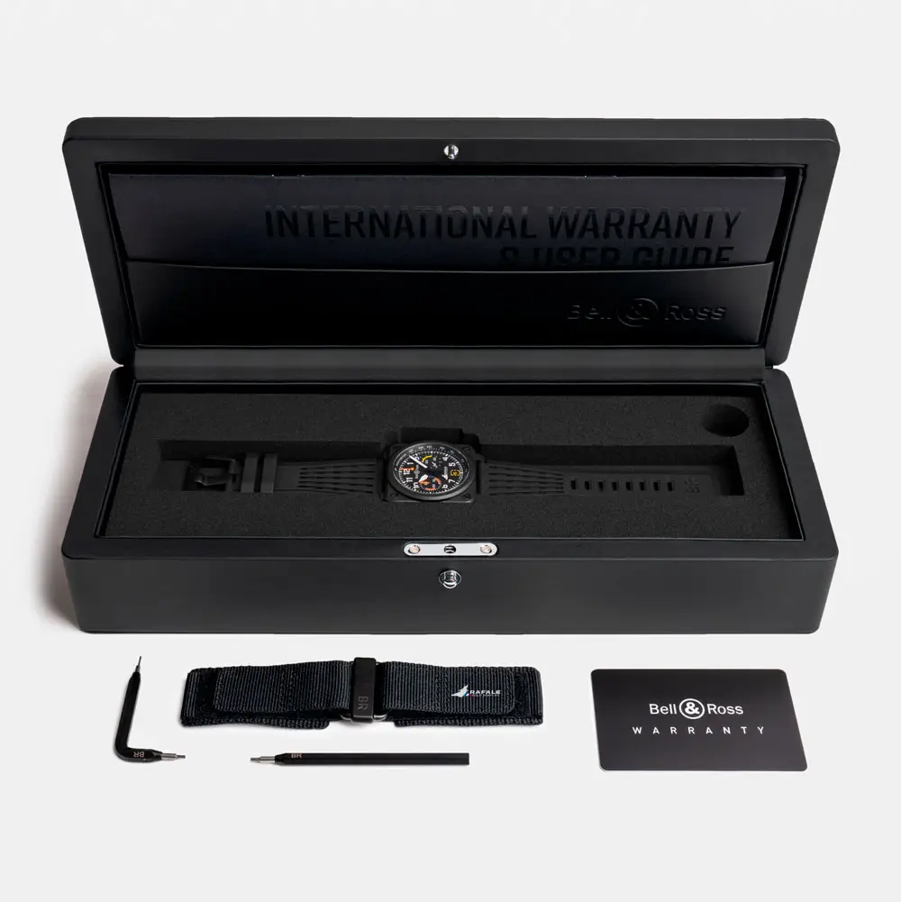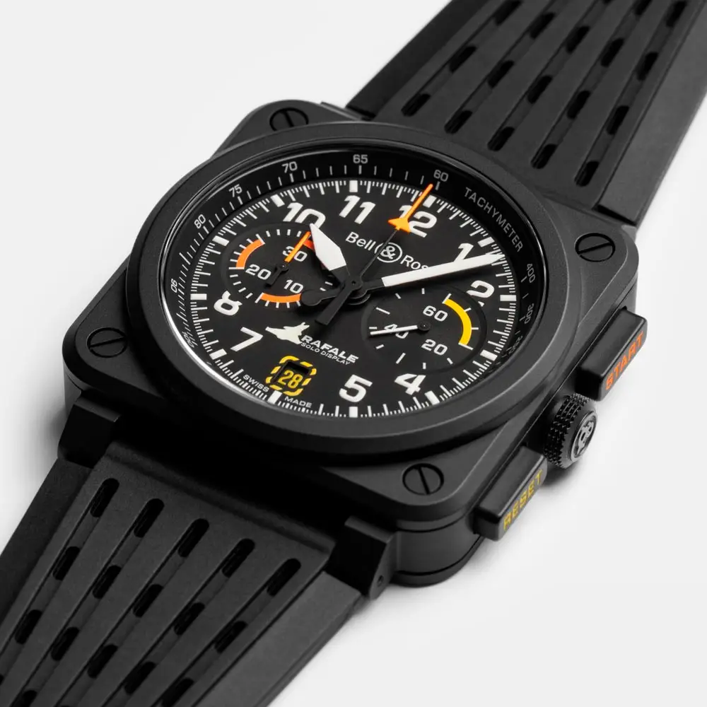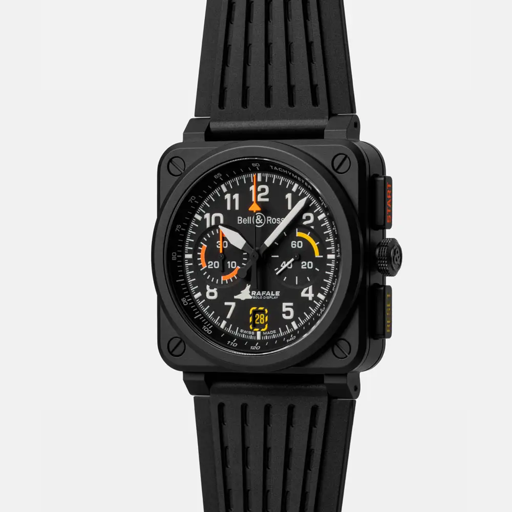 Inside beats the reliable automatic BR-CAL.301 chronograph movement, offering a power reserve of up to 42 hours. The matte black dial features bold white luminous Arabic numerals, contrasting orange chronograph hands, and a subtle silhouette of the Rafale jet on the seconds hand – a refined nod to the partnership.