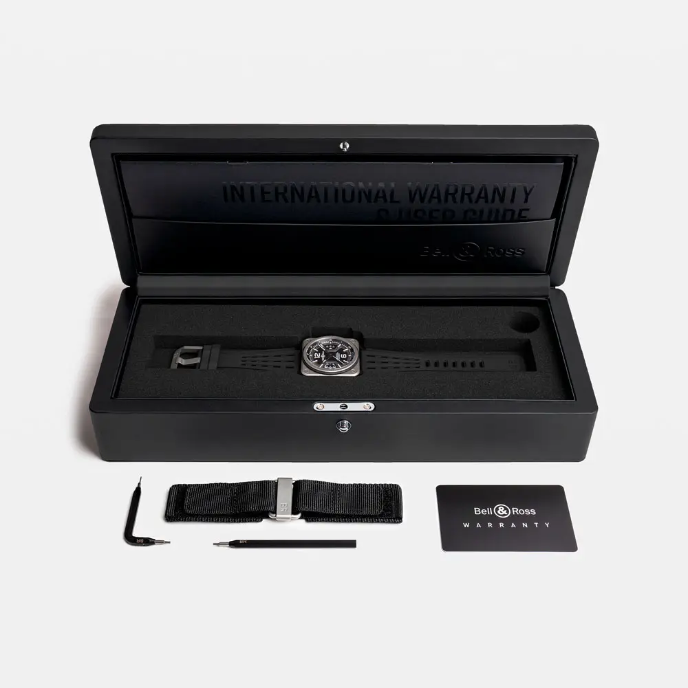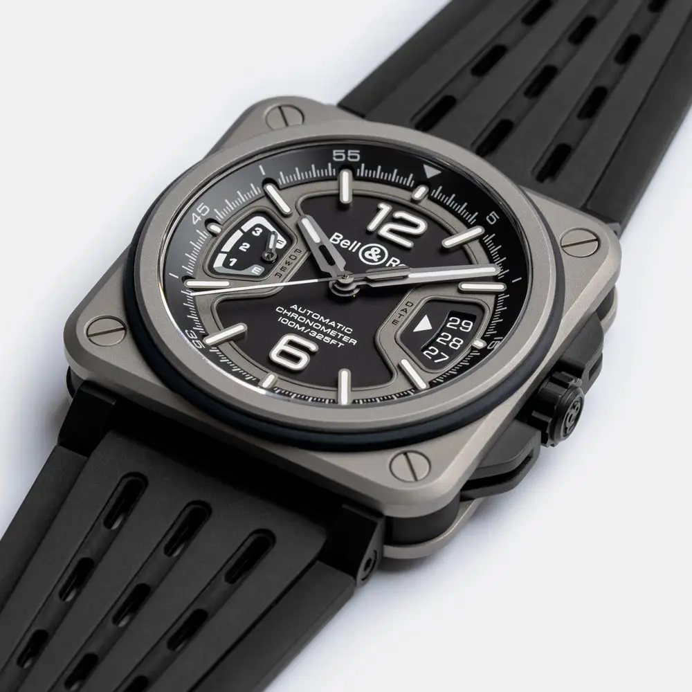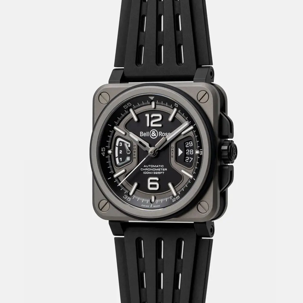 Water-resistant to 100 meters, the watch is fitted with a perforated rubber strap that underscores its sporty spirit. The Bell & Ross BR-X3 Black Titanium is the perfect choice for those who seek a blend of high performance, contemporary aesthetics, and bold style.