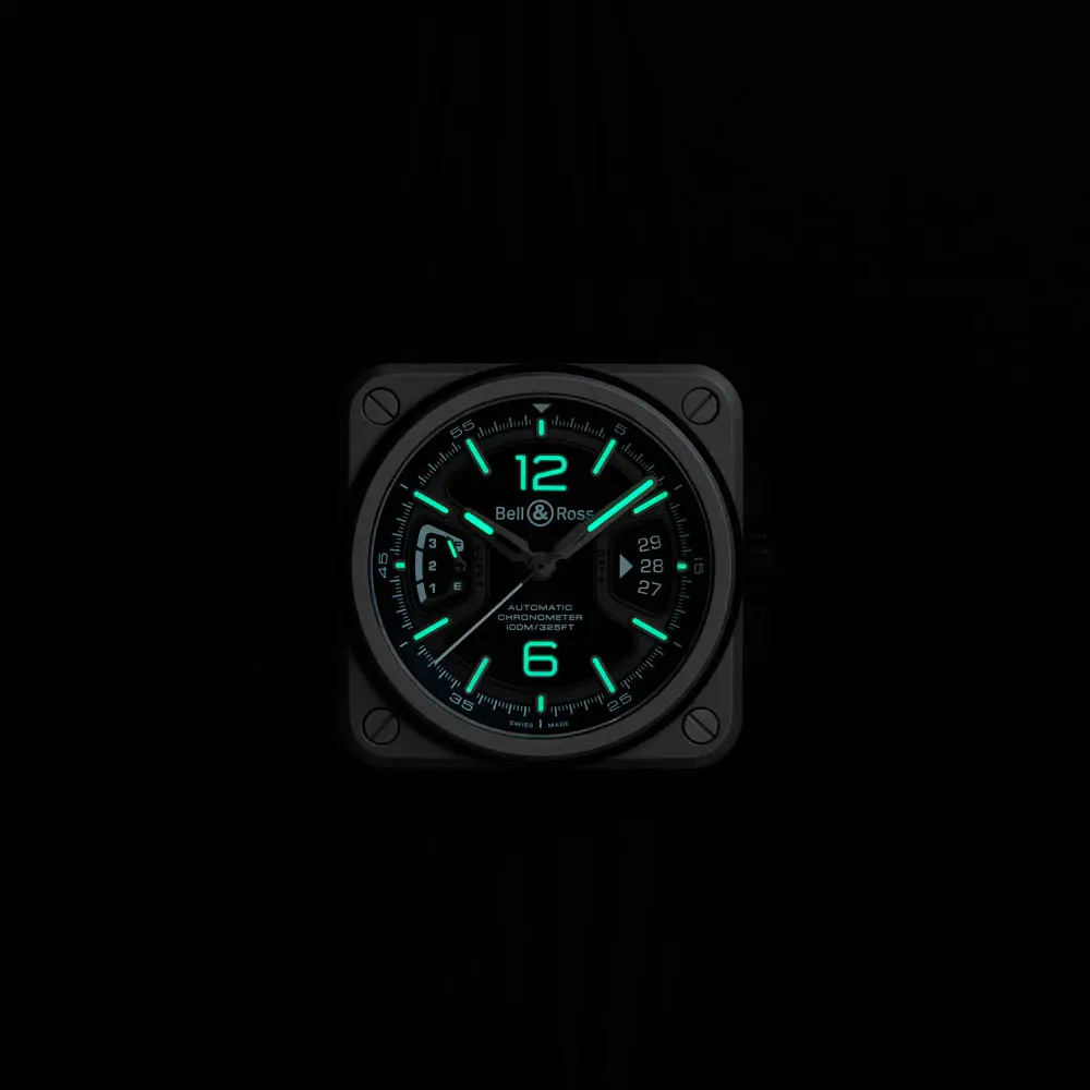 At its heart beats the automatic BR-CAL.323 movement, developed in collaboration with Kenissi. This caliber is COSC-certified, offering a power reserve of up to 70 hours and ensuring precision and reliability. The structured black dial features a power reserve indicator at 9 o’clock and a date window at 3 o’clock.