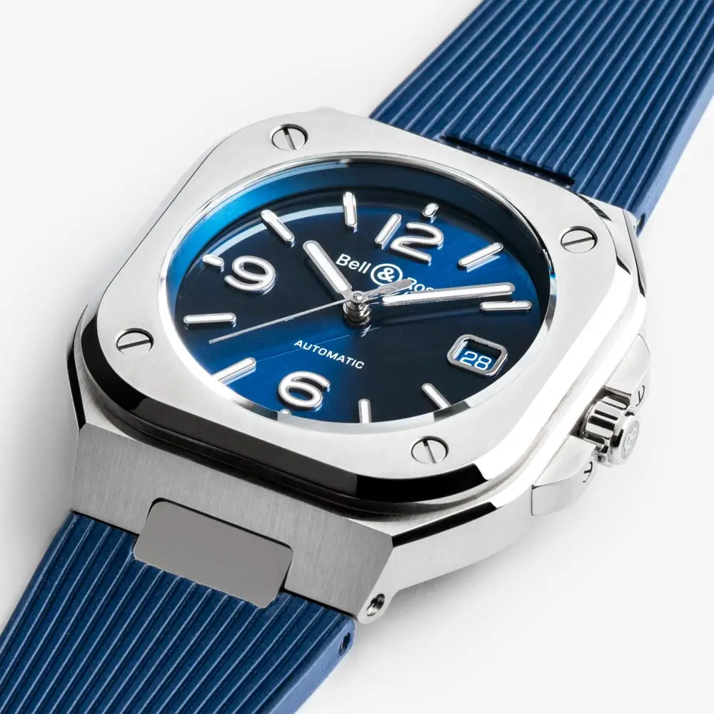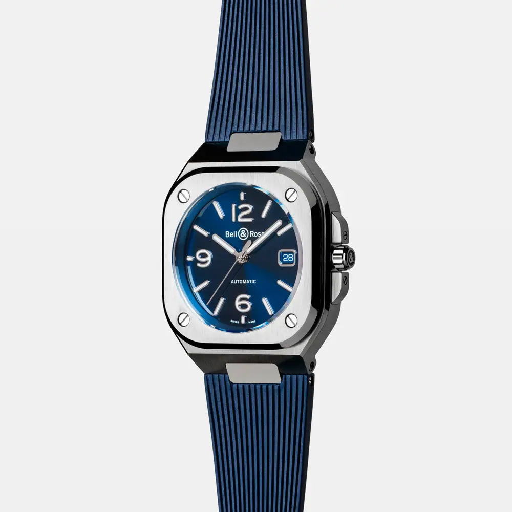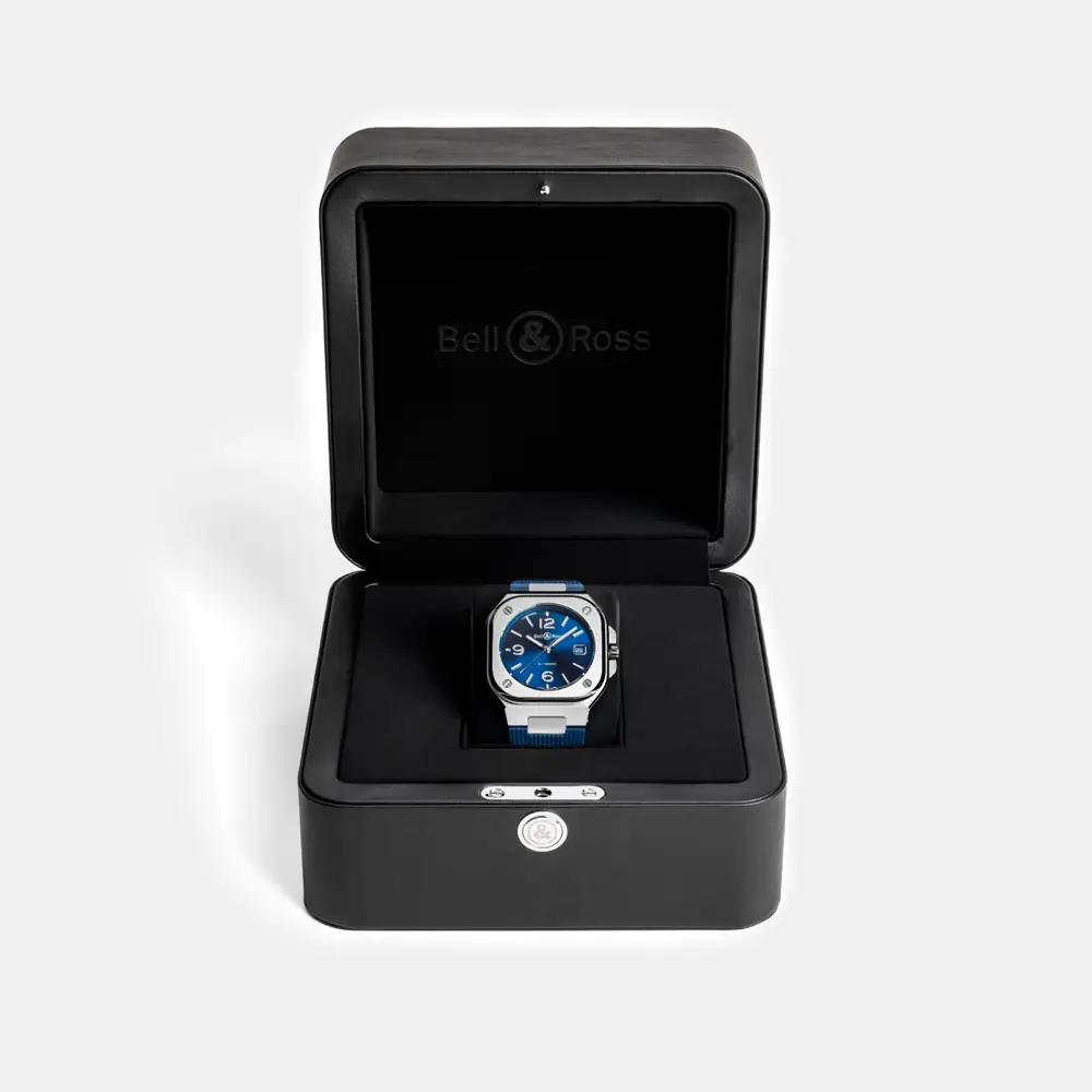 The Bell & Ross BR 05 Blue Steel elegantly combines technical precision with modern style. Its 40 mm square stainless steel case features a timeless design that fits perfectly on the wrist.