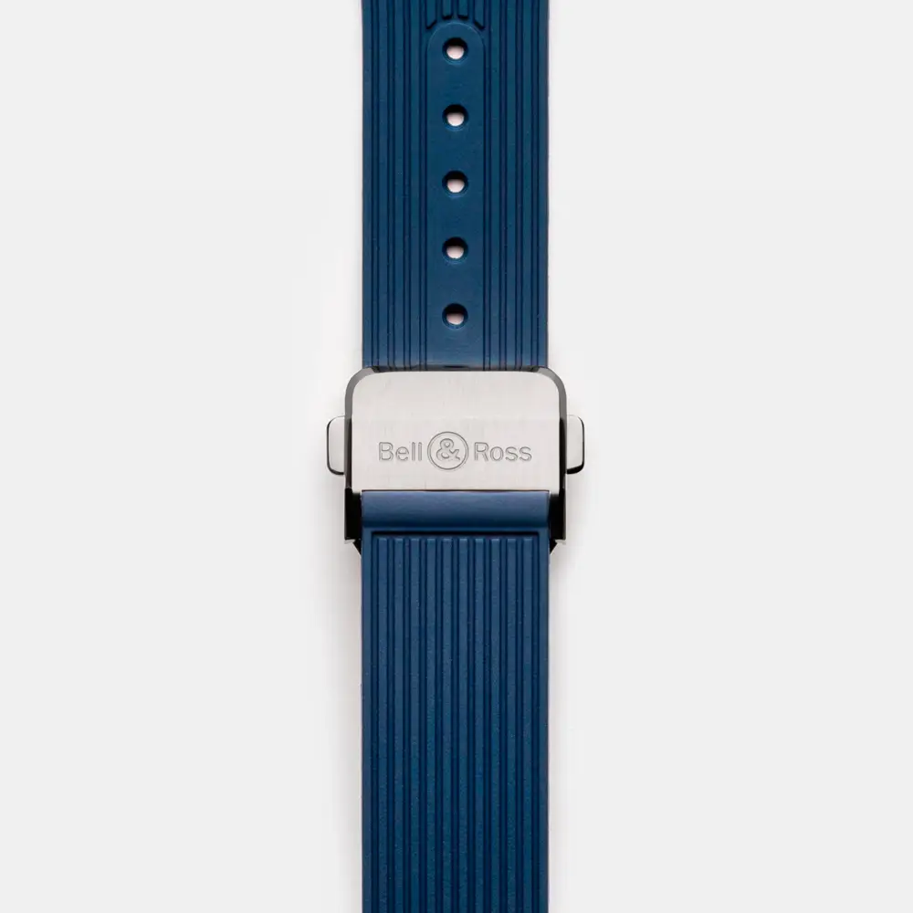 It is completed with a blue rubber strap, secured by a folding clasp for both comfort and durability. Its 10 ATM (100 m) water resistance ensures dependability even in wet conditions.