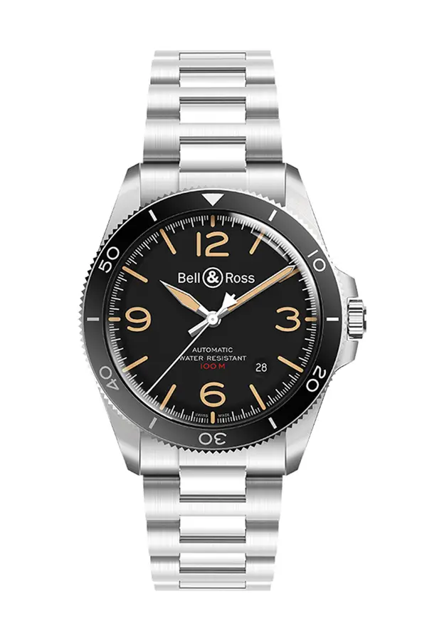 The Bell & Ross men's waterproof aviation watch from the Vintage luxury watch collection, designed for men who believe it's possible to combine elegance with an active lifestyle. It has a black dial with date and chronograph, which is set in a steel case. The strap with a fold-over clasp is made of the same material. The lunette is made of steel and aluminium.