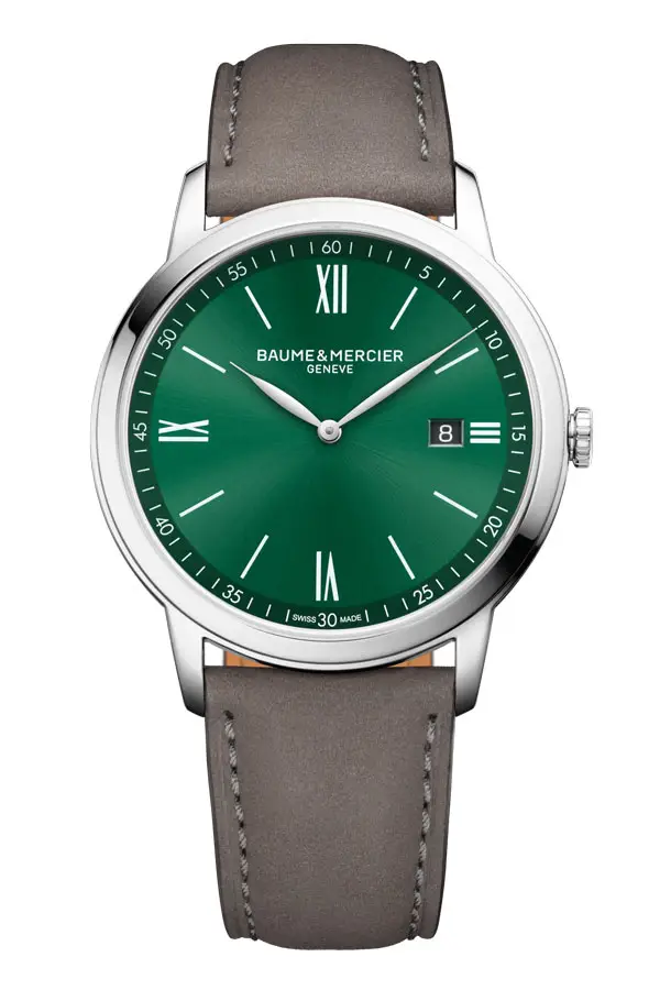 The green dial with a satin finish brings a fresh and modern touch to the watch. Silver hands and indexes, including Roman numerals at the 12, 3, 6, and 9 o'clock positions, ensure excellent readability. At the 3 o'clock position, there is a practical date indicator that adds functionality and convenience for daily use.