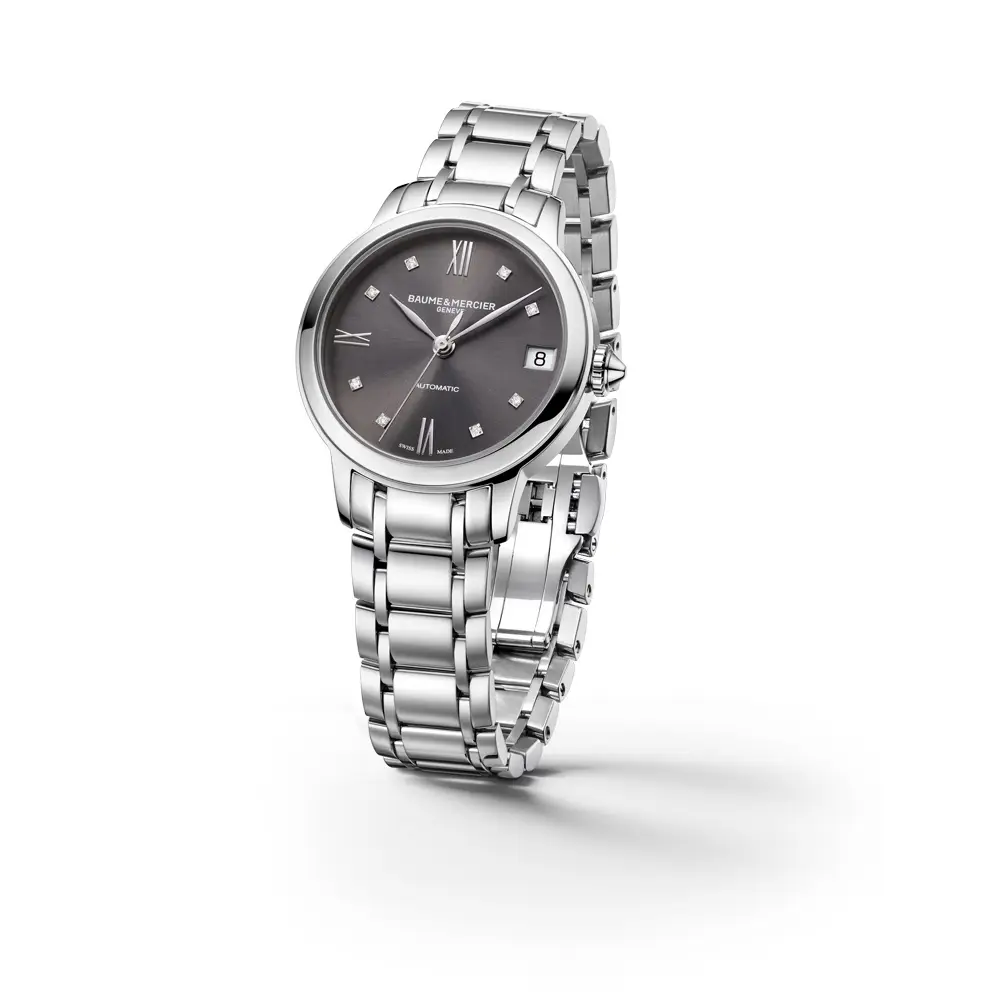 Baume & Mercier Classima M0A10610 perfectly blends timeless elegance and refined luxury. The 31 mm stainless steel case frames a sun-satin grey dial adorned with Roman numerals and eight diamond indexes, adding a touch of feminine sophistication. The design reflects the pure and harmonious aesthetic that defines the Classima collection.