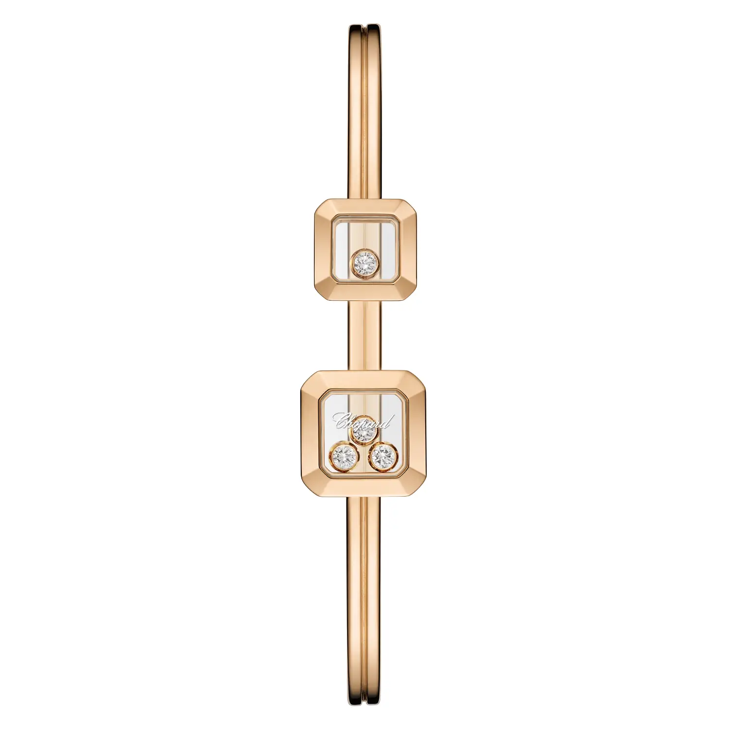 Chopard Happy Diamonds Icons Bangle 85A114-5002 celebrates joy, movement, and feminine elegance. Crafted from 18-carat ethical rose gold, this delicate bangle exudes a warm, romantic glow. At its heart are free-moving diamonds enclosed between two sapphire crystals, dancing gracefully with every wrist movement – an iconic Happy Diamonds signature that embodies freedom and the joy of life. Detailed product description