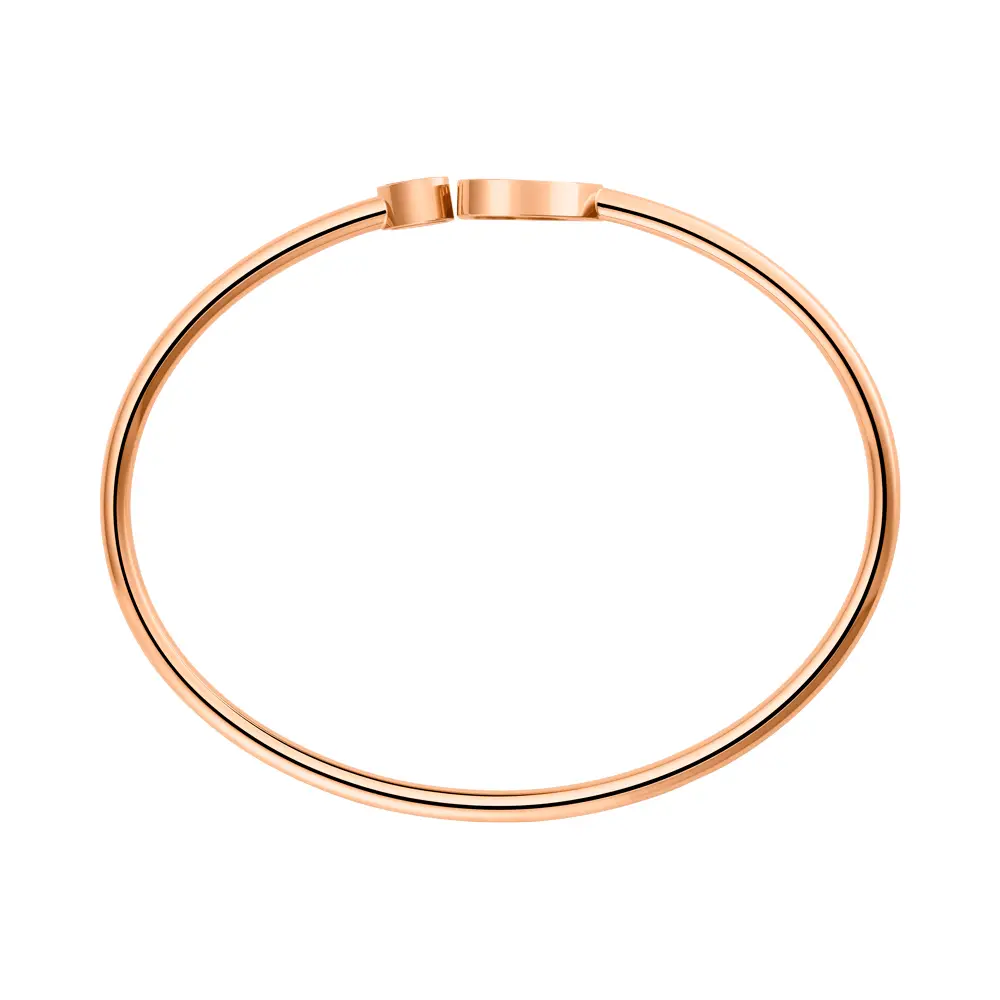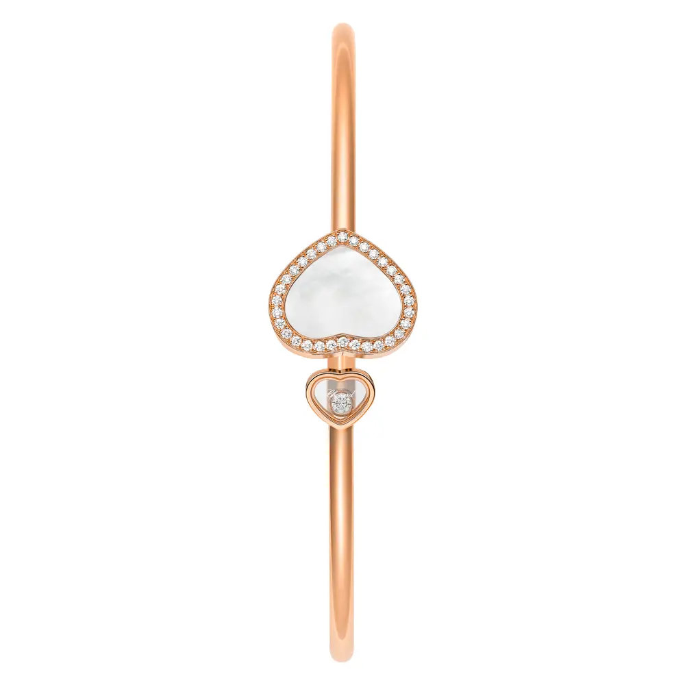 Crafted in 18kt rose gold, it features two heart motifs – one adorned with white mother-of-pearl, the other enclosing a floating diamond (0.05 ct) between two sapphire crystals. The open “cuff” design gives it a modern touch and ensures a comfortable fit. Each movement of the wrist brings the diamond to life, shimmering as a symbol of joy and freedom.