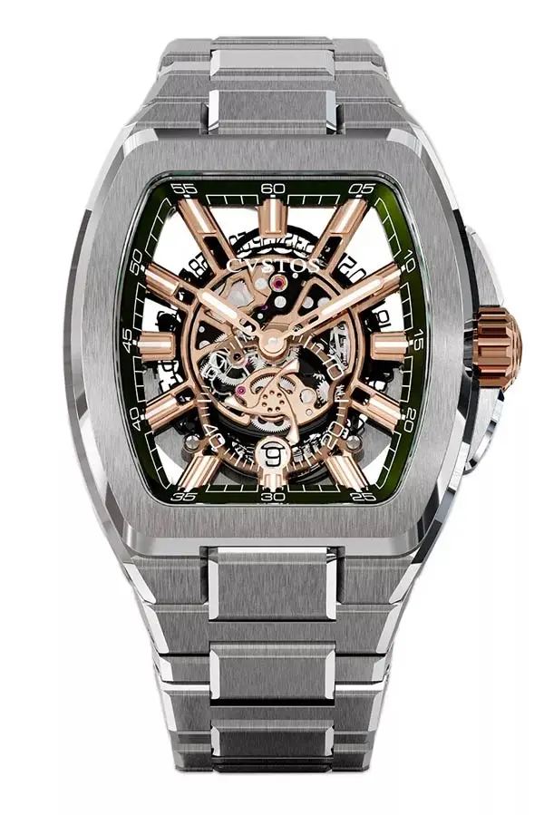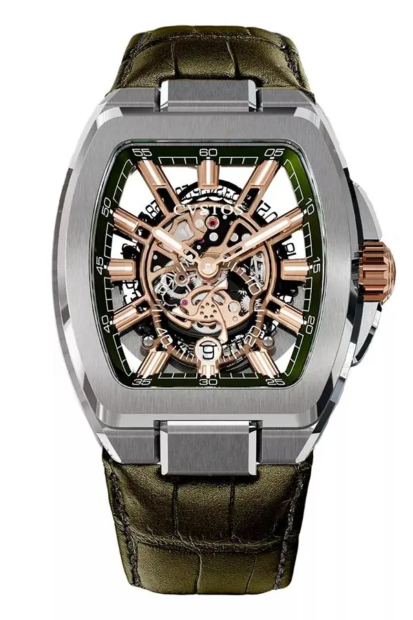 Its tonneau-shaped case crafted from titanium, measuring 51 x 42 mm, feels robust yet surprisingly lightweight – titanium offers both durability and everyday comfort. The sapphire crystal protects a striking gold-tone skeletonized analog dial, revealing the intricate beauty of the CVS410 SQLT automatic movement, which boasts a power reserve of approximately 42 hours.