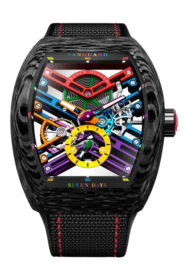 Design elements such as large applied numerals, distinctive hands, sporty rubber or textile straps and skeletonised dials give the Vanguard collection a distinctive and contemporary look. Watches often include complications such as a chronograph, tourbillon or automatic date calibre, all powered by Franck Muller's own mechanical movements.