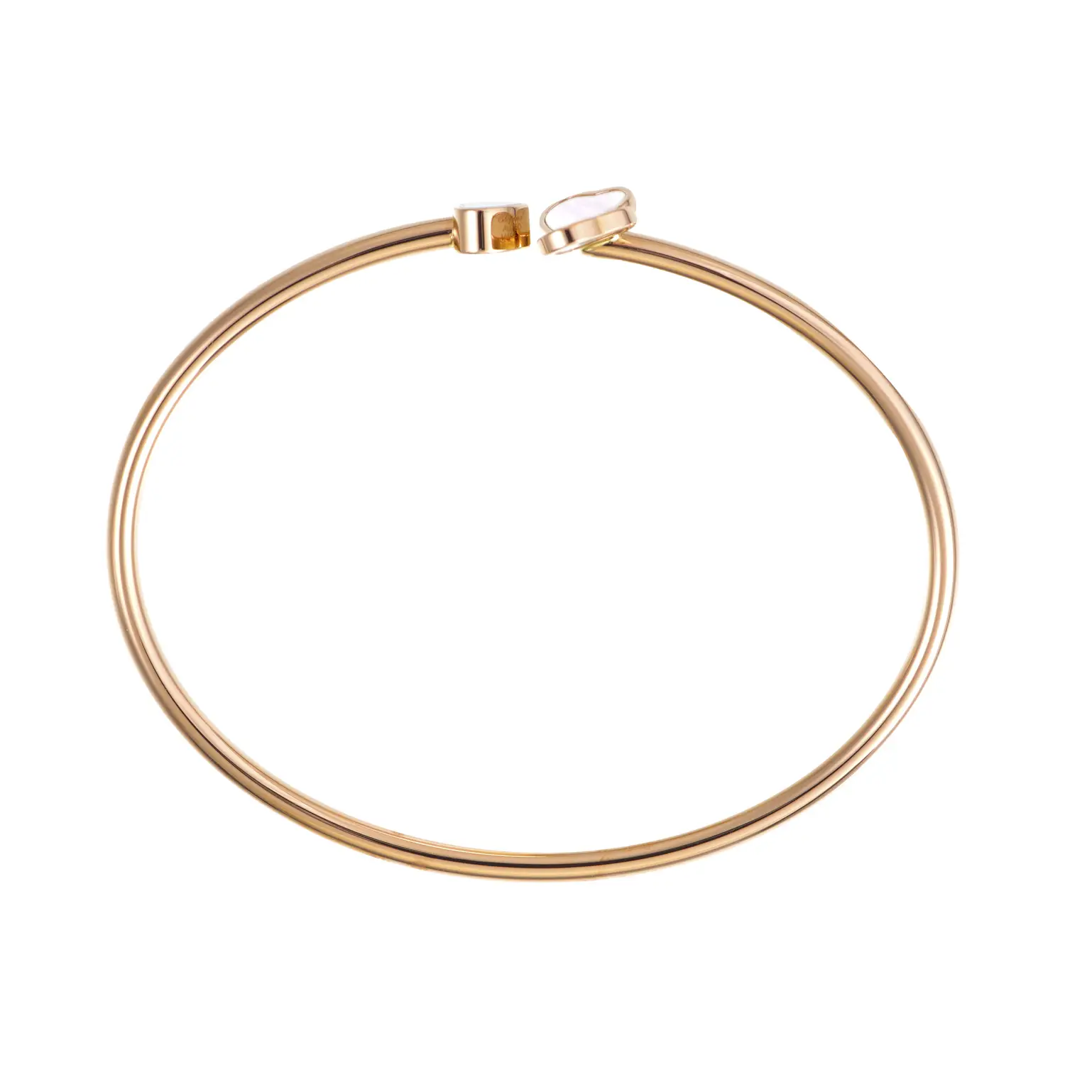 The Chopard Happy Hearts Wings 85A083-5301 bangle combines delicacy, symbolism and timeless elegance. Crafted in 18kt rose gold, it features two mother-of-pearl hearts and one iconic “dancing diamond” of 0.05 ct, embodying joy and lightness – hallmarks of Chopard’s creations.