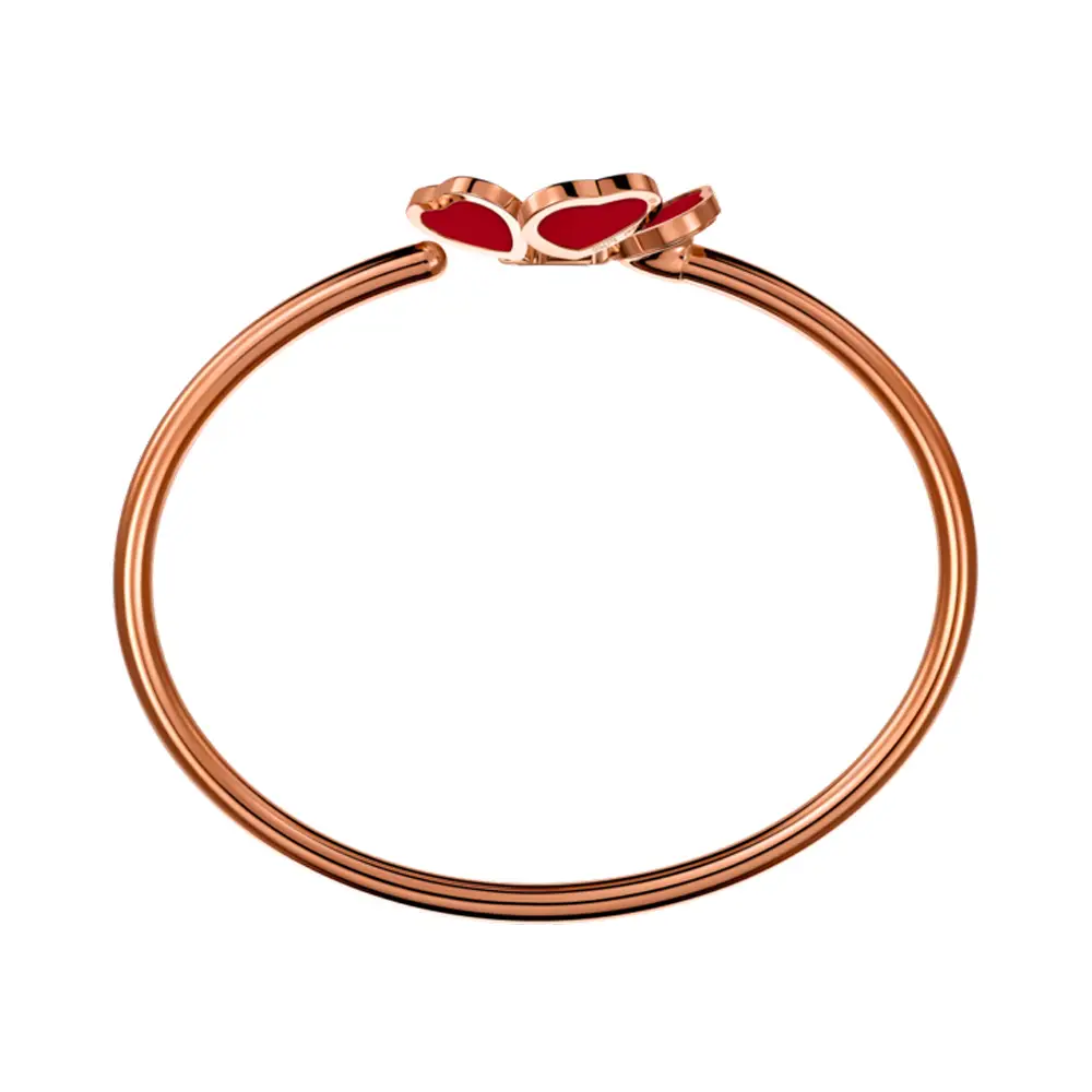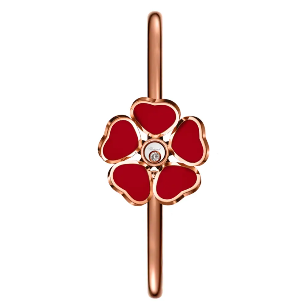 Crafted in 18kt rose gold, the bracelet features a floating diamond (0.05 ct) that shimmers with every movement, alongside a red stone heart and floral motif. Measuring 17 cm in length, it ensures a graceful and comfortable fit. Each detail reflects the refined craftsmanship and joyful character of the Happy Hearts Flowers collection.