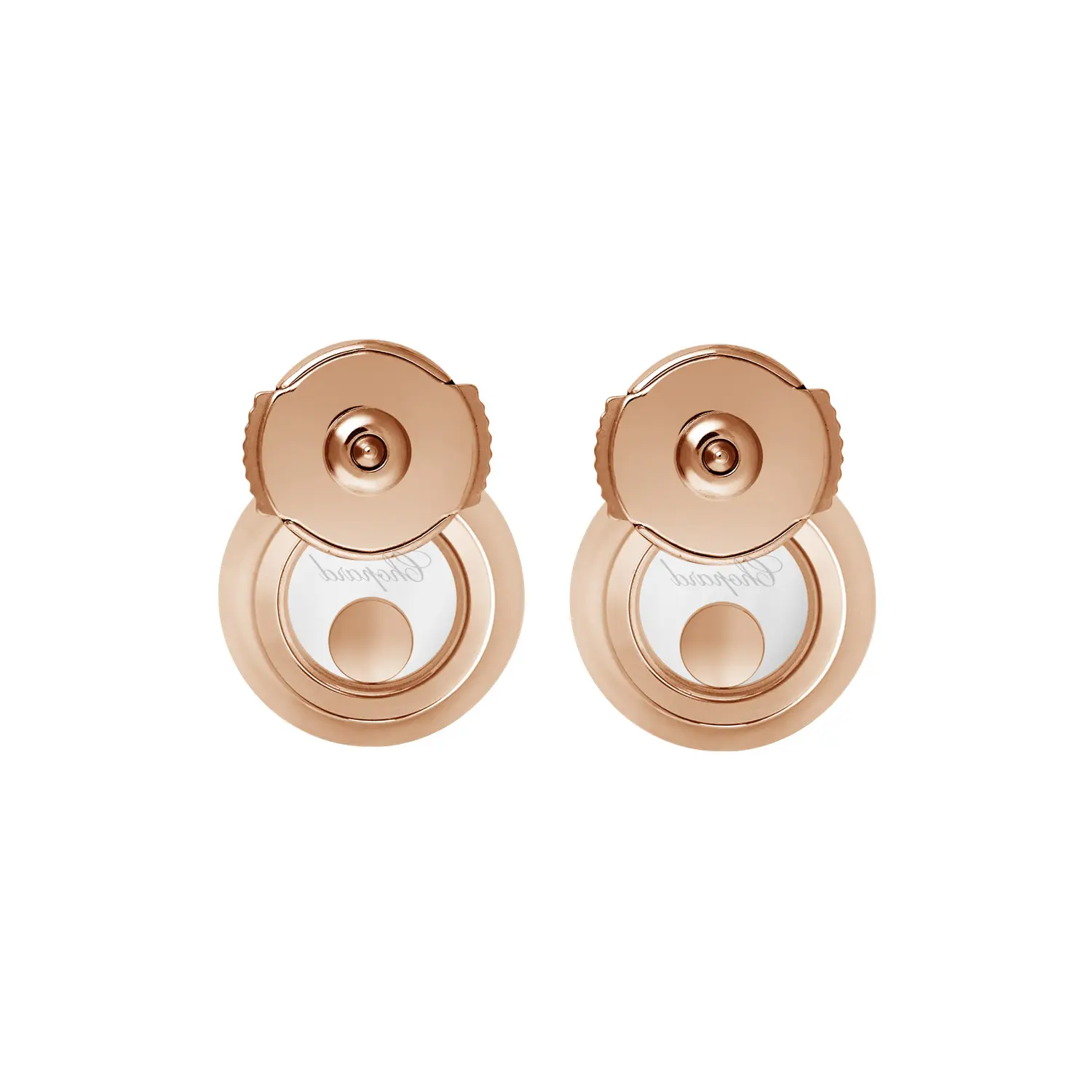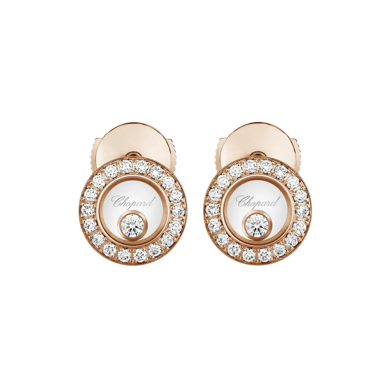 The Chopard Happy Diamonds Icons 83A017-5201 earrings embody the perfect harmony of light, motion, and feminine elegance. Crafted from 18k ethical rose gold, they feature freely moving brilliant-cut diamonds with a total weight of approximately 0.38 ct, gracefully gliding between two sapphire crystals — a hallmark of the Happy Diamonds collection that symbolizes joy and freedom.