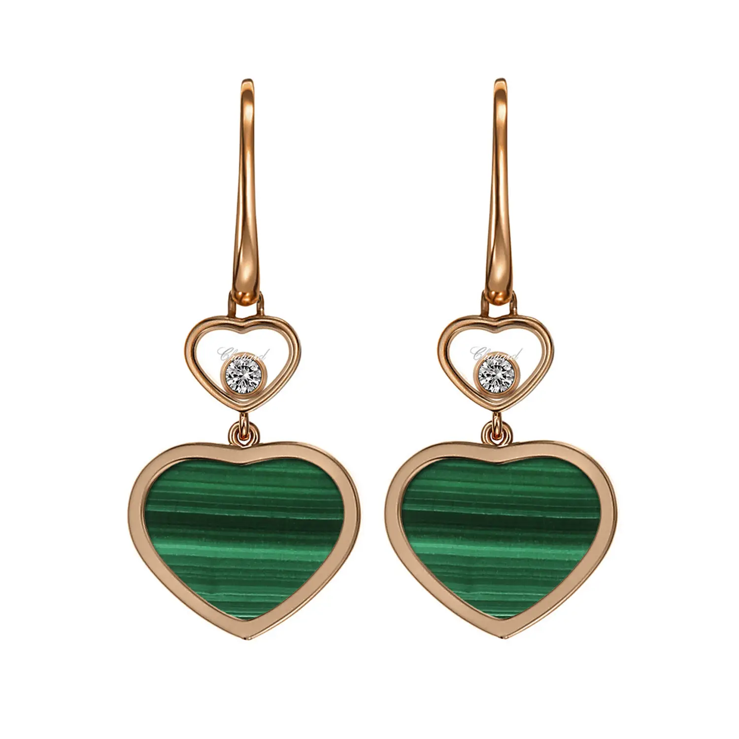 The Chopard Happy Hearts 837482-5111 earrings beautifully combine feminine elegance and joyful luxury. Crafted from ethical 18-carat rose gold, they feature green malachite hearts and brilliant white diamonds (total 0.10 ct) set within smaller gold hearts. Each movement catches the light, creating a mesmerizing sparkle.