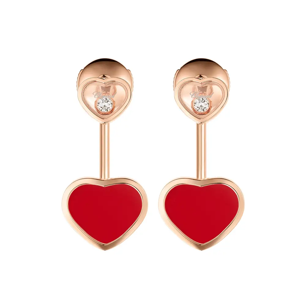 The focal point is 2 main heart-shaped (Heart) stones in vivid red, adding a distinctive accent. Extra sparkle comes from diamonds totaling 0.08 ct (2 stones), round cut / Round, white (origin: natural), with exceptional clarity IF–VVS and color F–G. The precise setting enhances the stones’ brilliance and the purity of the lines—resulting in timeless, feminine, and striking earrings that pair effortlessly with other Chopard jewels.