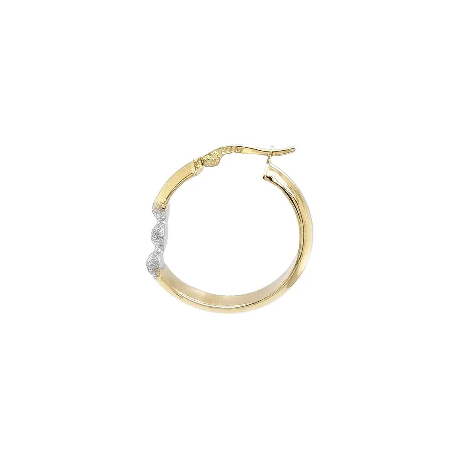 These elegant gold hoop earrings combine a polished yellow-gold surface with decorative matte white-gold half-spheres, creating a modern and feminine contrast. The 24.60 mm diameter offers a versatile size suitable for both everyday wear and special occasions.